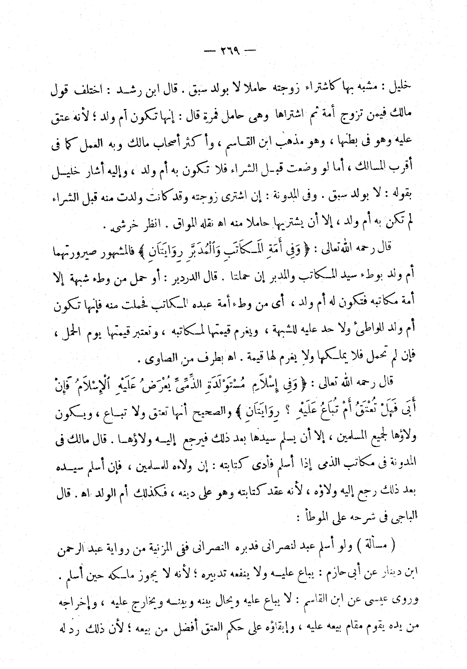 قال رحمه الله تعالى: (وفي إسلام مستولدة الذمي يعرض عليه الإسلام فإن أبى فهل تعتق أم تباع عليه؟ روايتان)، والصحيح أنها تعتق ولا تباع، ويكون ولاؤها لجميع المسلمين، إلا أن يسلم سيدها بعد ذلك فيرجع إليه ولاؤها. قال مالك في المدونة في مكاتب الذمي إذا أسلم فأدى كتابته: إن ولاء للمسلمين، فإن أسلم سيده بعد ذلك رجع إليه ولاؤه؛ لأنه عقد كتابته وهو على دينه، فكذلك أم الولد. اهـ. قال الباجي في شرحه على الموطأ: