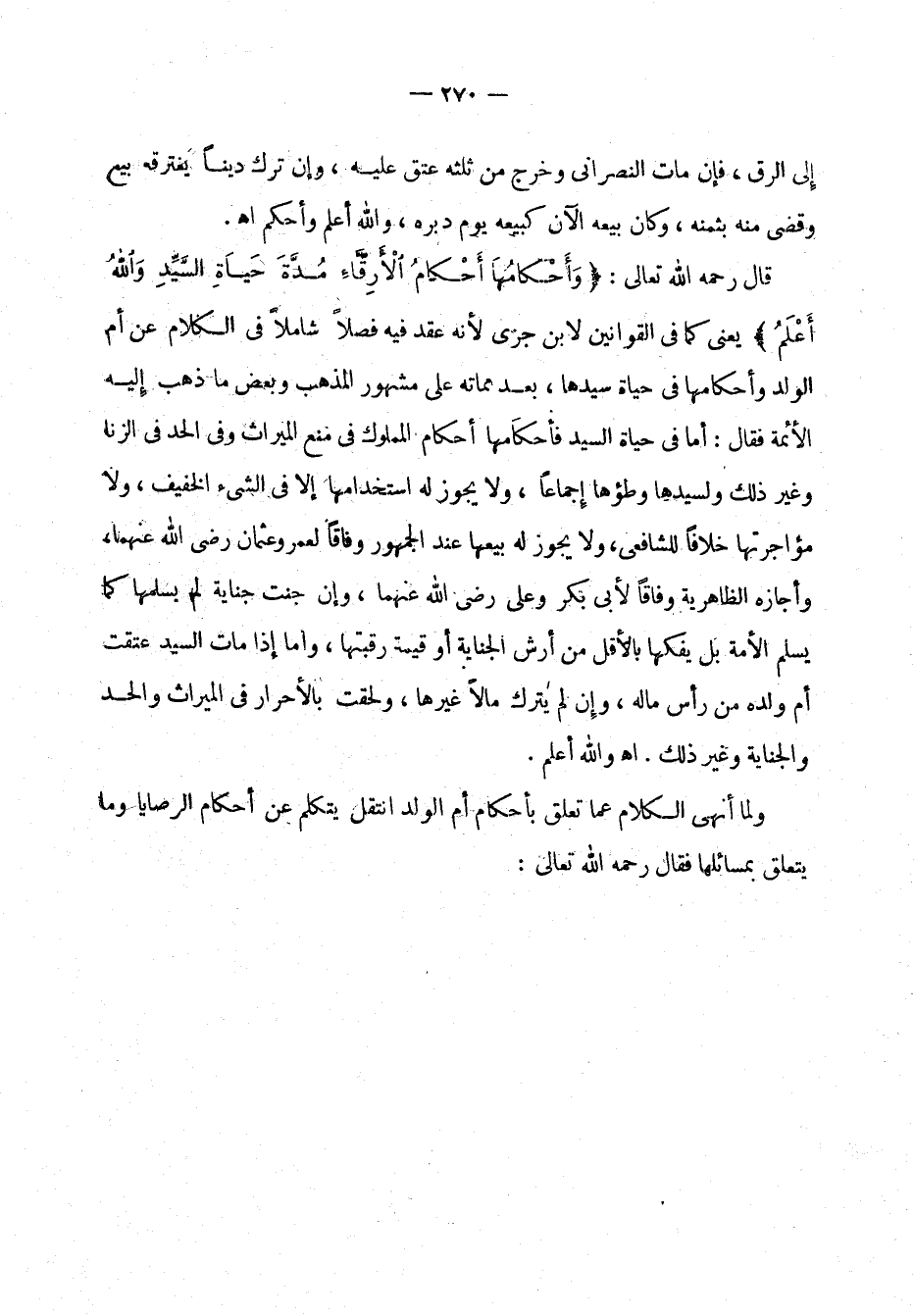 قال رحمه الله تعالى: (وأحكامها أحكام الأرقاء مدة حياة السيد، والله أعلم)، يعني كما في القوانين لابن جزي لأنه عقد فيه فصلاً شاملاً في الكلام على أم الولد وأحكامها في حياة سيدها، بعد مماته على مشهور المذهب وبعض ما ذهب إليه الأئمة، فقال: أما في حياة السيد فأحكامها أحكام المملوك في منع الميراث وفي الحد في الزنا وغير ذلك، ولسيدها وطؤها إجماعًا، ولا يجوز له استخدامها إلا في الشيء الخفيف، ولا مؤاجرتها خلافًا للشافعي، ولا يجوز له بيعها عند الجمهور وفاقًا لعمر وعثمان، رضي الله عنهما، وأجازه الظاهرية وفاقًا لأبي بكر وعلي، رضي الله عنهما، وإن جنت جناية لم يسلمها كما يسلم الأمة بل يفكها بالأقل من أرش الجناية أو قيمة رقبتها، وأما إذا مات السيد عتقت أم ولده من رأس ماله، وإن لم يترك مالاً غيرها، ولحقت بالأحرار في الميراث والحد والجناية وغير ذلك. اهـ. والله أعلم.
