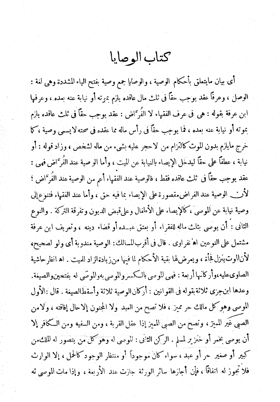أي في بيان ما يتعلق بأحكام الوصية، والوصايا جمع وصية، بفتح الياء المشددة، وفي لغة: الوصل، وعرفًا عقد يوجب حقًا في ثلث مال عاقده يلزم بموته أو نيابة عنه بعده. وعرفها ابن عرفة بقوله: هي في عرف الفقهاء لا الفُراض: عقد يوجب حقًا في لثلث عاقده يلزم بموته أو نيابة عنه بعده، فما يوجب حقًا في رأس ماله مما عقده في صحته لا يسمى وصية، كما خرج ما يلزم بدون الموت كالتزام من لا حجر عليه بشيء من ماله لشخص، وزاد قوله: أو نيابة، عطفًا على حقًا ليدخل الإيصاء بالنيابة عن الميت، وأما الوصية عند الفراض فهي: عقد يوجب حقًا في ثلث عاقده فقط، فالوصية عند الفقهاء أعم من الوصية عند الفرائض؛ لأن الوصية عند الفراض مقصورة على الإيصاء بما فيه حق، وأما عند الفقهاء فتنوع إلى وصية نيابة عن الموصي، كالإيصاء على الأطفال وعلى قبض الديون وتفرقة التركة. والنوع الثاني: أن يوصي بثلث ماله للفقراء أو بعتق عبده أو قضاء دينه، وتعريف ابن عرفة مشتمل على النوعين. اهـ. النفراوي.