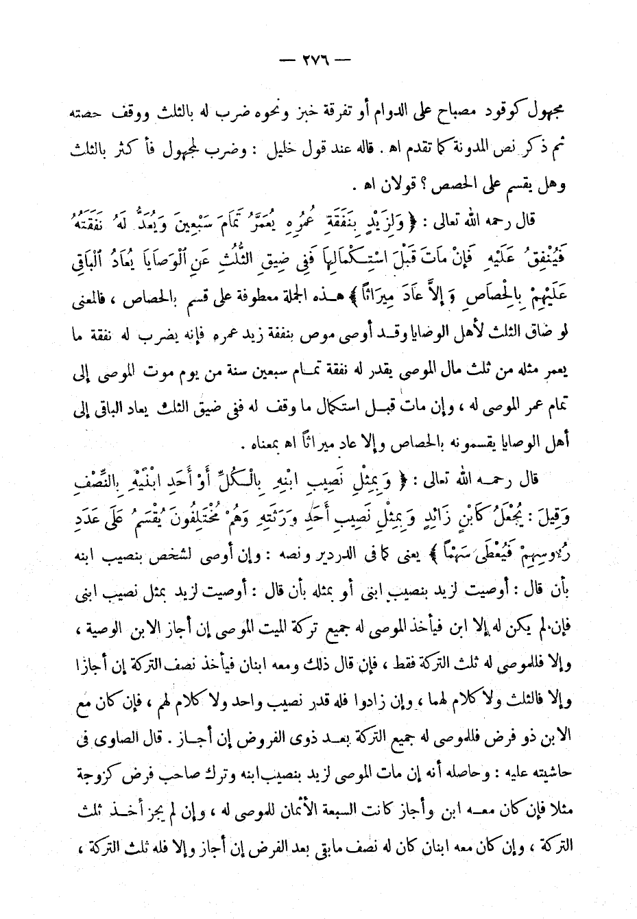 قال رحمه الله تعالى: (ولزيد بنفقة عمره يعمر تمام سبعين ويعد له نفقته فينفق عليه فإن مات قبل استكمالها ففي ضيق الثلث عن الوصايا يعاد الباقي عليهم بالحصاص وإلا عاد ميراثًا)، هذه الجملة معطوفة على قسم بالحصاص، فالمعنى لو ضاق الثلث لأهل الوصايا وقد أوصى موص بنفقة زيد عمره فإنه يضرب له نفقة ما يعمر مثله من ثلث مال الموصي يقدر له نفقة تمام سبعين سنة من يوم موت الموصي إلى تمام عمر الموصى له، وإن مات قبل استكمال ما وقف له ففي ضيق الثلث يعاد الباقي إلى أهل الوصايا يقسمونه بالحصاص وإلا عاد ميراثًا اهـ. بمعناه.