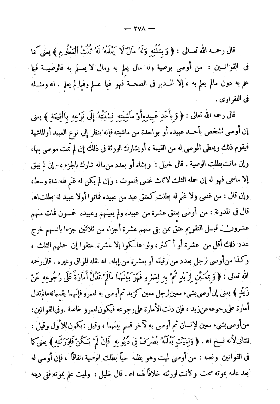 قال رحمه الله تعالى: (وبأحد عبيده أو ماشيته نسبته إلى نوعه بالقيمة)، يعني إن أوصى لشخص بأحد عبيده أو بواحدة من ماشيته فإنه ينظر إلى نوع العبيد أو الماشية فيقوم ذلك ويعطى الموصى له من القيمة، أو يشارك الورثة في ذلك إن لم تمت موصى بها، وإن ماتت بطلت الوصية. قال خليل: وبشاة أو بعدد من ماله شارك بالجزء، إن لم يبق إلا ما سمى فهو له إن حمله الثلث لا ثلث غنمي فتموت، وإن لم يكن له غنم فله شاة وسط، وإن قال: من غنمي ولا غنم له بطلت كعتق عبد من عبيده فماتوا أو لا عبيد له بطلت اهـ. قال في المدونة: من أوصى بعتق عشرة من عبيده ولم يعينهم وعبيده خمسون فمات منهم عشرون قبل التقويم عتق ممن بقي منهم عشرة أجزاء من ثلاثين جزءًا بالسهم خرج عدد ذلك أقل من عشرة أو أكثر، ولو هلكوا إلا عشرة عتقوا إن حملهم الثلث، وكذا من أوصى لرجل بعدد من رقيقه أو بعشرة من إبله. اهـ. نقله المواق وغيره. قال رحمه الله تعالى: (وبمعين لزيد ثم به لعمرو فهو بينهما ما لم تدل أمارة على رجوعه عن زيد)، يعني إن أوصى بشيء معين لرجل معين كزيد ثم أوصى به لعمرو فإنهما يقسمانه ما لم تدل أمارة على رجوعه عن زيد، فإن دلت الأمارة على رجوعه فيكون لعمرو خاصة. وفي القوانين: من أوصى بشيء معين لإنسان ثم أوصى به لآخر قسم بينهما، وقيل: يكون للأول، وقيل: للثاني؛ لأنه نسخ. اهـ. (ولميت يعلمه