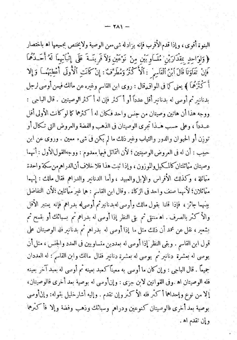 مالك: إنهما متماثلان؛ لأنهما صنف واحد في الزكاة. وقال ابن القاسم: هما غير متماثلين؛ لأن التفاضل بينهما جائز، فإذا قلنا بقول مالك وأوصى له بدنانير ثم أوصى له بدراهم فإنه يعتبر الأقل والأكثر بالصرف. اهـ. المنتقى، ثم بقي النظر إذا أوصى له بدراهم ثم بسبائك أو بقمح ثم شعير، نقل عن محمد أن ذلك مثل ما إذا أوصى له بدراهم ثم بدنانير فله الوصيتان على قول ابن القاسم. وبقي النظر إذا أوصى له بعددين متساويين في العدد والجنس، مثل أن يوصي له بعشرة دنانير ثم يوصي له بعشرة دنانير فقال مالك وابن القاسم: له العددان جميعًا. قال الباجي: وإن كان ما أوصى به معينًا كعبد بعينه ثم أوصى له بعبد آخر بعينه فله الوصيتان. اهـ. وفي القوانين لابن جزي: وإن أوصى له بوصية بعد أخرى فالوصيتان، إلا من نوع وإحداهما أكثر فله الأكثر وإن تقدم. وإليه أشار خليل بقوله: وإن أوصى بوصية بعد أخرى فالوصيتان كنوعين ودراهم وسبائك وذهب وفضة وإلا فأكثرهما وإن تقدم. اهـ.