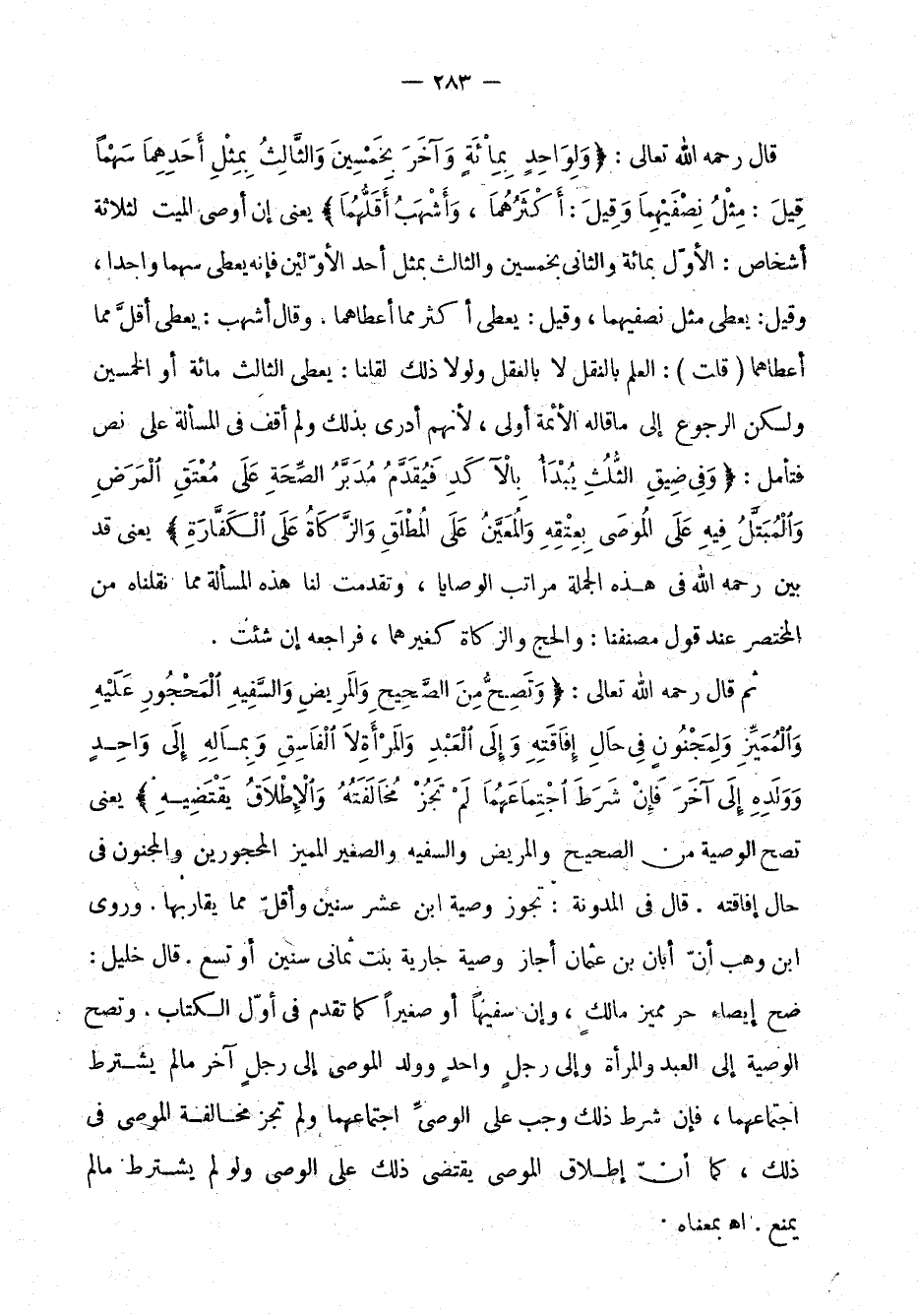 قال رحمه الله تعالى: (ولواحد بمائة وآخر بخمسين والثالث بمثل أحدهما سهمًا قيل: مثل نصفيهما وقيل: أكثرهما، وأشهب أقلهما)، يعني إن أوصى الميت لثلاثة أشخاص: الأول بمائة والثاني بخمسين والثالث بمثل أحد الأولين فإنه يعطى سهمًا واحدًا، وقيل: يعطى مثل نصفيهما، وقيل: يعطى أكثر مما أعطاهما. وقال أشهب: يعطى أقل مما أعطاهما، قلت: العلم بالنقل لا بالعقل ولولا ذلك لقلنا: يعطى الثلث مائة أو الخمسين ولكن الرجوع إلى ما قاله الأئمة أولى؛ لأنهم أدرى بذلك ولم أقف في المسألة على نص فتأمل: (وفي ضيق الثلث يبدأ بالآكد فيقدم مدبر الصحة على معتق المرض والمبتل فيه على الموصى بعتقه والمعين على المطلق والزكاة على الكفارة)، يعني قد بين رحمه الله في هذه الجملة مراتب الوصايا، وتقدمت لنا هذه المسألة مما نقلناه من المختصر عند قول مصنفنا: والحج والزكاة كغيرهما، فراجعه إن شئت.