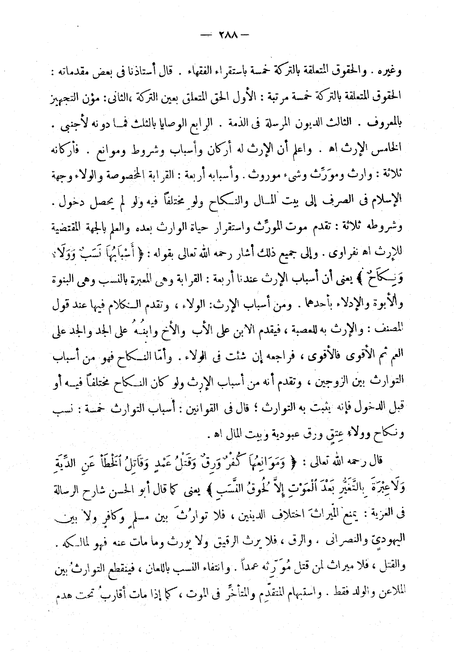 وغيره. والحقوق المتعلقة بالتركة خمسة باستقراء الفقهاء. قال أستاذنا في بعض مقدماته: الحقوق المتعلقة بالتركة خمسة مرتبة: الأول: الحق المتعلق بعين التركة. الثاني: مؤمن التجهيز بالمعروف. الثالث: الديون المرسلة في الذمة. الرابع: الوصايا بالثلث فما دونه لأجنبي. الخامس: الإرث. اهـ. واعلم أن الإرث له أركان وأسباب وشروط وموانع. فأركانه ثلاثة: وارث ومورث وشيء موروث. وأسبابه أربعة: