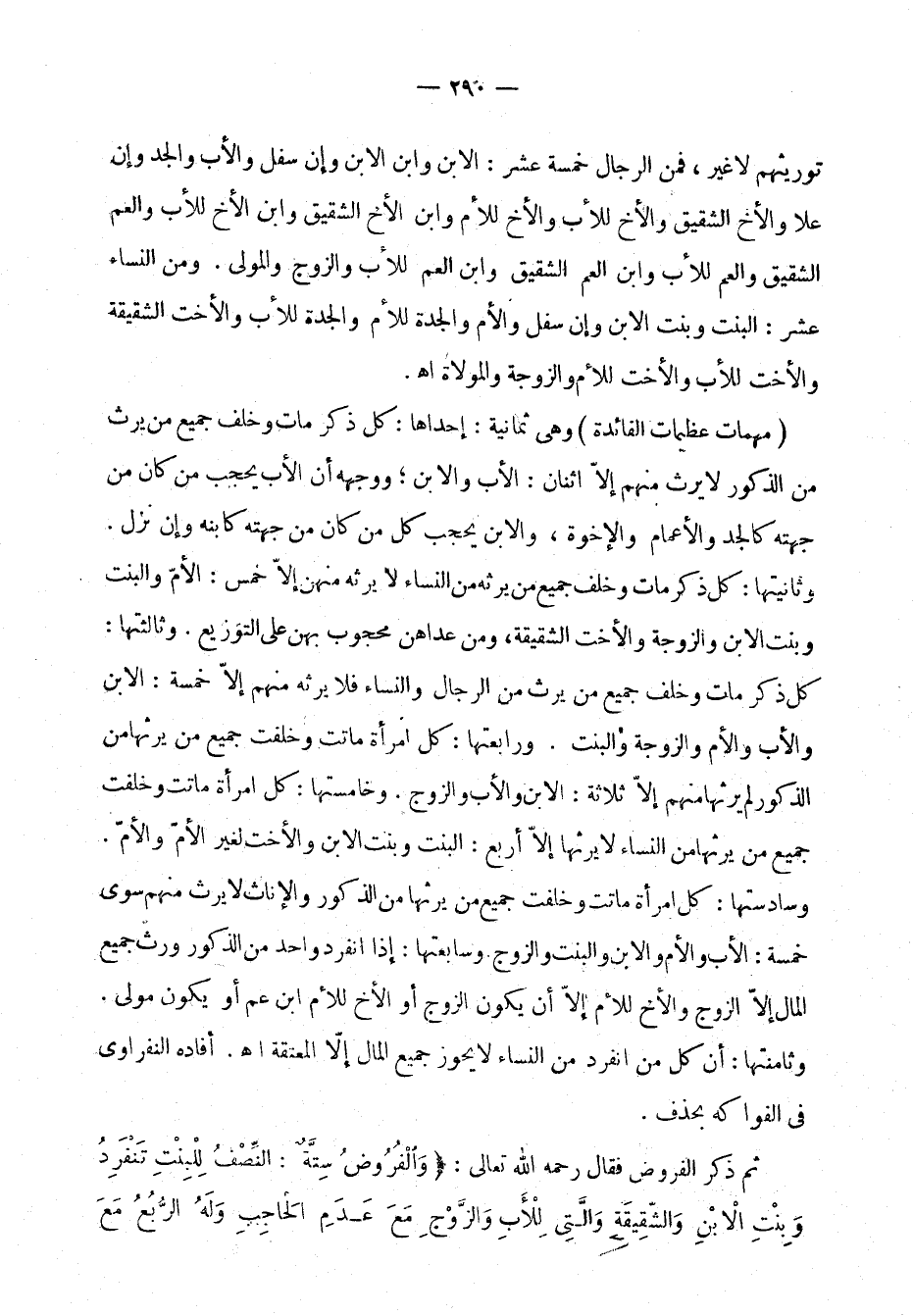 (مهمات عظيمات الفائدة) وهي ثمانية: إحداها: كل ذكر مات وخلف جميع من يرث من الذكور لا يرث منهم إلا اثنان: الأب والابن، ووجهه أن الأب يحجب من كان من جهته كالجد والأعمام والإخوة، والابن يحجب كل من كان من جهته كابنه وإن نزل. وثانيتها: كل ذكر مات وخلف جميع من يرثه من النساء لا يرثه منهن إلا خمس: الأم والبنت وبنت الابن والزوجة والأخت الشقيقة، ومن عداهن محجوب بهن على التوزيع. وثالثتها: كل ذكر مات وخلف جميع من يرث من الرجال والنساء فلا يرثه منهم إلا خمسة: الابن والأب والأم والزوجة والبنت. ورابعتها: كل امرأة ماتت وخلفت جميع من يرثها من الذكور لم يرثها منهم إلا ثلاثة: الابن والأب والزوج. وخامستها: كل امرأة ماتت وخلفت جميع من يرثها من النساء لا يرثها إلا أربع: البنت وبنت الابن والأخت لغير الأم والأم. وسادستها: كل امرأة ماتت وخلفت جميع من يرثها من الذكور والإناث لا يرث منهم سوى خمسة: الأب والأم والابن والبنت والزوج. وسابعتها: إذا انفرد واحد من الذكور ورث جميع المال إلا الزوج والأخ للأم إلا أن يكون الزوج أو الأخ للأم ابن عم أو يكون مولى. وثامنتها: أن كل من انفرد من النساء لا يحوز جميع المال إلا المعتقة اهـ. أفاده النفراوي في الفواكه بحذف.