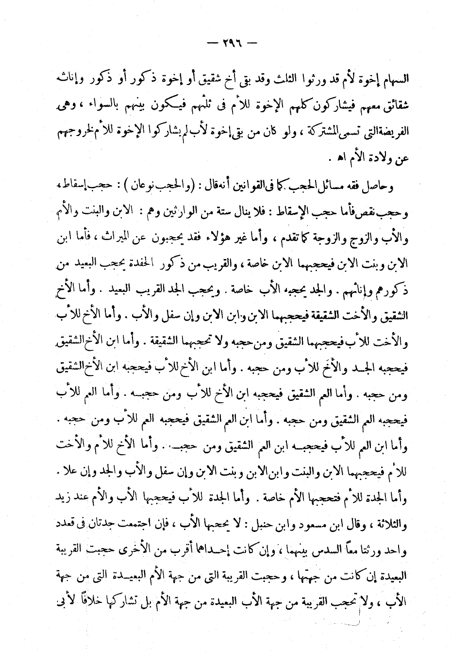 ومن حجبه. وأما ابن الأخ للأب فيحجبه ابن الأخ الشقيق ومن حجبه. وأما العم الشقيق فيحجبه ابن الأخ للأب ومن حجبه. وأما العم للأب فيحجبه العم الشقيق ومن حجبه. وأما ابن العم الشقيق فيحجبه العم للأب ومن حجبه. وأما ابن العم للأب فيحجبه ابن العم الشقيق ومن حجبه. وأما الأخ للأم والأخت للأم فيحجبهما الابن والبنت وابن الابن وبنت الابن وإن سفل والأب والجد وإن علا. وأما الجدة للأم فتحجبها الأم خاصة. وأما الجدة للأب فيحجبها الأب والأم عند زيد والثلاثة. وقال ابن مسعود وابن حنبل: لا يحجبها الأب، فإن اجتمعت جدتان في قعدد واحد ورثتا معًا السدس بينهما، وإن كانت إحداهما أقرب من الأخرى حجبت القريبة البعيدة إن كانت من جهتها، وحجبت القريبة التي من جهة الأم البعيدة التي من جهة الأب، ولا تحجب القريبة من جهة الأب البعيدة من جهة الأم بل تشاركها خلافًا لأبي