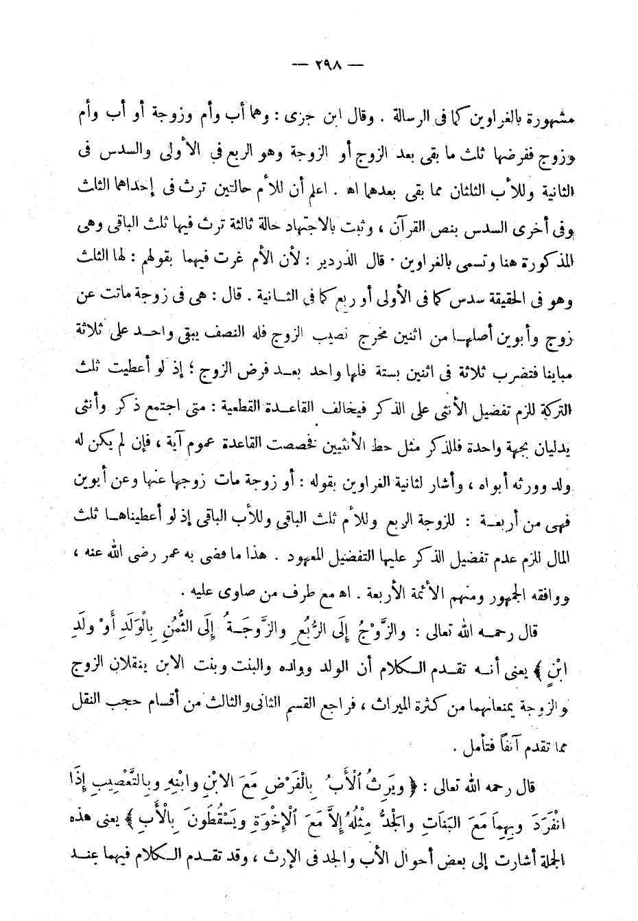 مشهورة بالغراوين كما في الرسالة. وقال ابن جزي: وهما أب وأم وزوجة أو أب وأم وزوج ففرضها ثلث ما بقي بعد الزوج أو الزوجة وهو الربع في الأولى والسدس في الثانية وللأب الثلثان مما بقي بعدهما اهـ. اعلم أن للأم حالتين ترث في إحداهما الثلث وفي أخرى السدس بنص القرآن، وثبت بالاجتهاد حالة ثالثة ترث فيها ثلث الباقي وهي المذكورة هنا وتسمى بالغراوين. قال الدردير: لأن الأم غرت فيهما بقولهم: لها الثلث وهو في الحقيقة سدس كما في الأولى أو ربع كما في الثانية. قال: هي في زوجة ماتت عن زوج وأبوين أصلها من اثنين مخرج نصيب الزوج فله النصف يبقى واحد على ثلاثة مباينًا فتضرب ثلاثة في اثنين بستة فلها واحد بعد فرض الزوج، إذ لو أعطيت ثلث التركة للزم تفضيل الأنثى على الذكر فيخالف القاعدة القطعية: متى اجتمع ذكر وأنثى يدليان بجهة واحدة فللذكر مثل حظ الأنثيين فخصصت القاعدة عموم آية، فإن لم يكن له ولد وورثه أبواه، وأشار لثانية الغراوين بقوله: أو زوجة مات زوجها عنها وعن أبوين فهي من أربعة: للزوجة الربع وللأم ثلث الباقي وللأب الباقي إذ لو أعطيناها ثلث المال للزم عدم تفضيل الذكر عليها التفضيل المعهود. هذا ما قضى به عمر، رضي الله عنه، ووافقه الجمهور ومنهم الأئمة الأربعة. اهـ. مع طرف من الصاوي عليه.