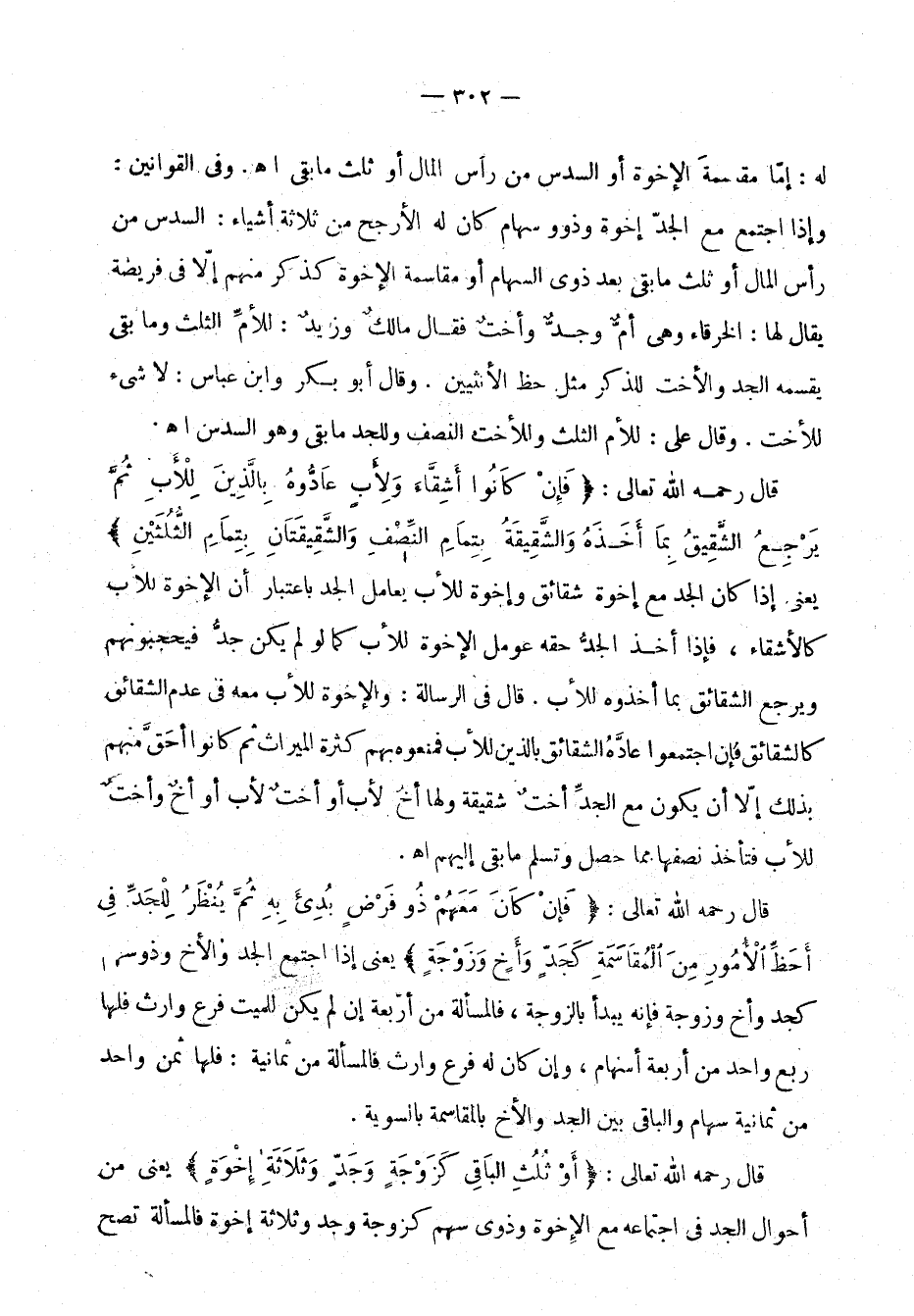 قال رحمه الله تعالى: (فإن كانوا أشقاء ولأب عادون بالذين للأب ثم يرجع الشقيق بما أخذه والشقيقة بتمام النصف والشقيقتان بتمام الثلثين)، يعني إذا كان الجد مع إخوة شقائق وإخوة للأب يعامل الجد باعتبار أن الإخوة للأب كالأشقاء، فإذا أخذ الجد حقه عومل الإخوة للأب كما لو لم يكن جد فيحجبونهم ويرجع الشقائق بما أخذوه للأب. قال في الرسالة: والإخوة للأب معه في عدم الشقائق كالشقائق فإن اجتمعوا عاده الشقائق بالذين للأب فمنعوه بهم كثرة الميراث ثم كانوا أحق منهم بذلك إلا أن يكون مع الجد أخت شقيقة ولها أخ لأب أو أخت لأب أو أخ وأخت للأب فتأخذ نصفها مما حصل وتسلم ما بقي إليهم اهـ.