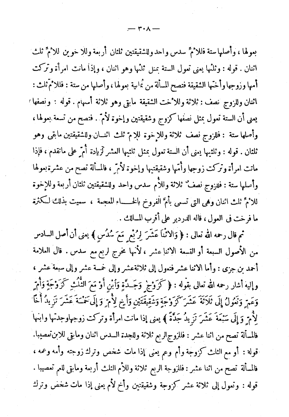 ثم قال رحمه الله تعالى: (والاثنا عشر لربع مع سدس)، يعني أن أصل السادس من الأصول السبعة أو التسعة الاثنا عشر؛ لأنها مخرج لربع مع سدس. قال العلامة أحمد بن جزي: وأما الاثنا عشر فتعول إلى ثلاثة عشر وإلى خمسة عشر وغلى سبعة عشر، وإليه أشار رحمه الله تعالى بقوله: (كزوج وجدة وابن أو مع الثلث كزوجة وأم وعم وتعول إلى ثلاثة عشر كزوجة وشقيقتين وأخ لأم وإلى خمسة عشر تزيد أخًا لأم وإلى سبعة عشر تزيد جدة)، يعني إذا ماتت امرأة وتركت زوجها وجدتها وابنها فالمسألة تصح من اثنا عشر: فللزوج الربع ثلاثة وللجدة السدس اثنان وما بقي للابن تعصيبًا. قوله: أو مع الثلث كزوجة وأم وعم يعني إذا مات شخص وترك زوجته وأمه وعمه، فالمسألة تصح من اثنا عشر: فللزوجة الربع ثلاثة وللأم الثلث أربعة وما بقي للعم تعصيبًا. قوله: وتعول إلى ثلاثة عشر كزوجة وشقيقتين وأخ لأم يعني إذا مات شخص وترك