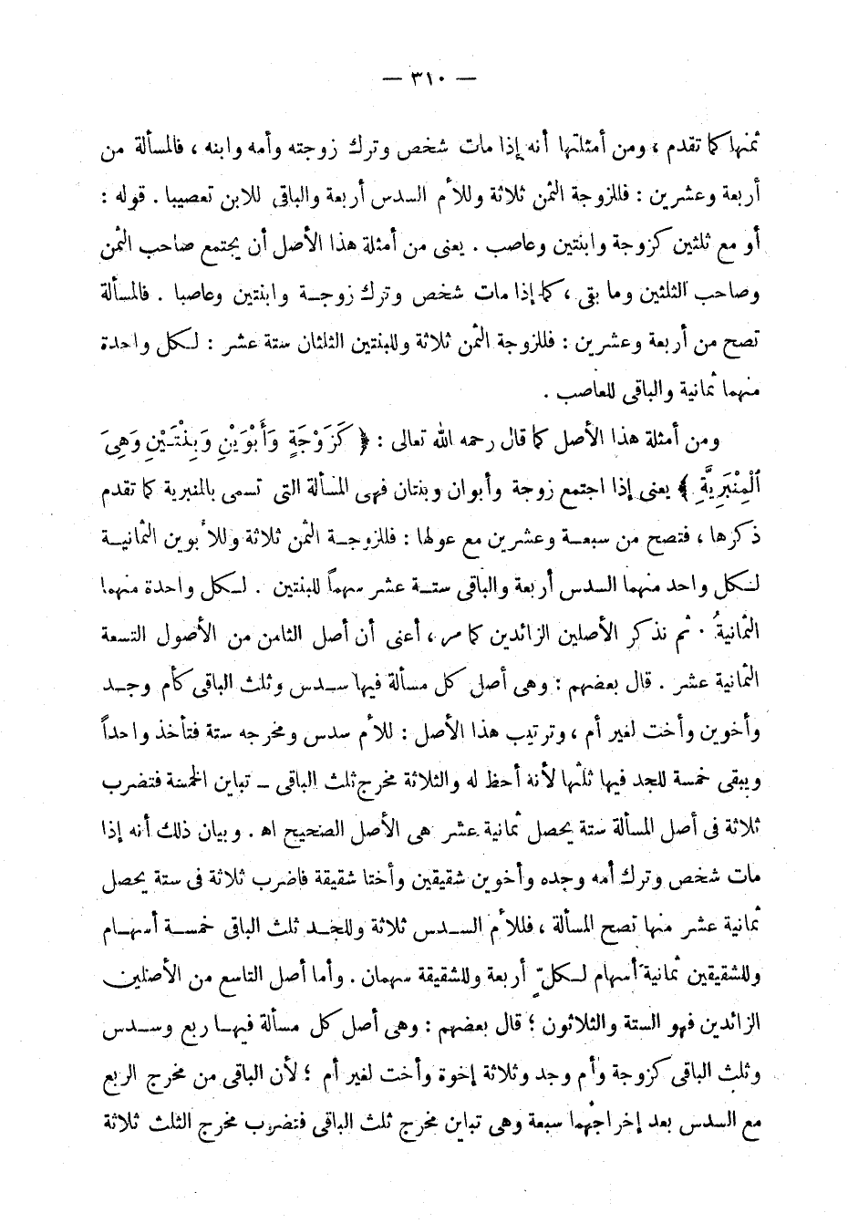 فيها سدس وثلث الباقي كأم وجد وأخوين وأخت لغير أم، وترتيب هذا الأصل: للأم سدس ومخرجه ستة فتأخذ واحدًا ويبقى خمسة للجد فيها ثلثها لأنها أحظ له والثلاثة مخرج ثلث الباقي - تباين الخمسة فتضرب ثلاثة في أصل المسألة ستة يحصل ثمانية عشر هي الأصل الصحيح اهـ. وبيان ذلك أنه إذا مات شخص وترك أمه وجده وأخوين شقيقين وأختًا شقيقة فاضرب ثلاثة في ستة يحصل ثمانية عشر منها تصح المسألة، فللأم السدس ثلاثة وللجد ثلث الباقي خمسة أسهام وللشقيقين ثمانية أسهام لكل أربعة وللشقيقة سهمان. وأما أصل التاسع من الأصلين الزائدين فهو الستة والثلاثون. قال بعضهم: وهي أصل كل مسألة فيها ربع وسدس وثلث الباقي كزوجة وأم وجد وثلاثة إخوة وأخت لغير أم؛ لأن الباقي من مخرج الربع مع السدس بعد إخراجهما سبعة وهي تباين مخرج ثلث الباقي فتضرب مخرج الثلث ثلاثة