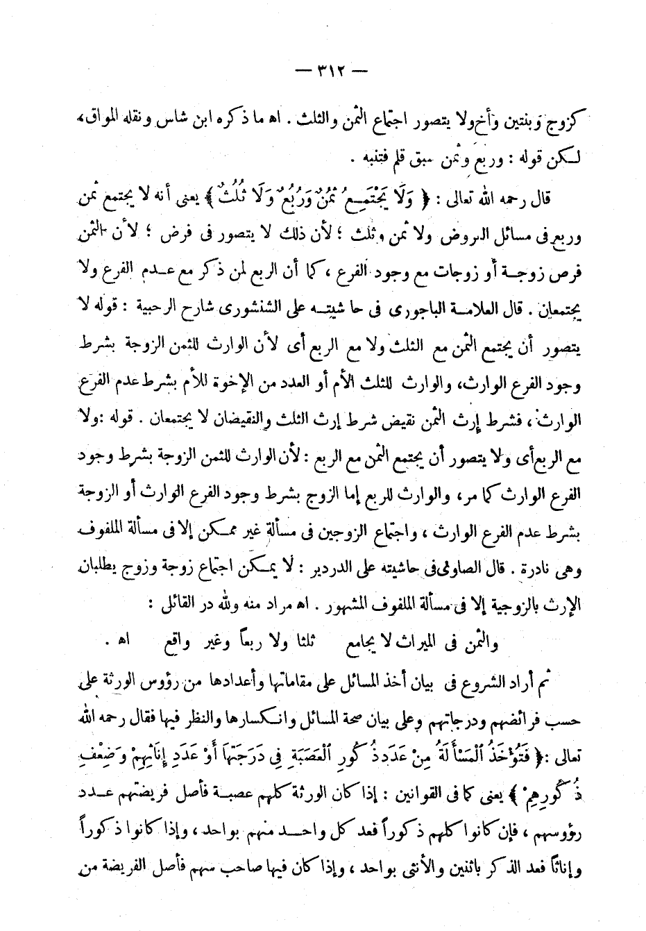 قال رحمه الله تعالى: (ولا يجتمع ثمن وربع ولا ثلث)، يعني أنه لا يجتمع ثمن وربع في مسائل العروض ولا ثمن وثلث؛ لأن ذلك لا يتصور في فرض؛ لأن الثمن فرض زوجة أو زوجات مع وجود الفرع، كما أن الربع لمن ذكر مع عدم الفرع ولا يجتمعان. قال العلامة الباجوري في حاشيته على الشنشوري شارح الرحبية: قوله لا يتصور أن يجتمع الثمن مع الثلث ولا مع الربع أي لأن الوارث للثمن الزوجة بشرط وجود الفرع الوارث، والوارث للثلث الأم أو العدد من الإخوة للأم بشرط عدم الفرع الوارث، فشرط إرث الثمن نقيض شرط إرث الثلث والنقيضان لا يجتمعان. قوله: ولا مع الربع أي ولا يتصور أن يجتمع الثمن مع الربع؛ لأن الوارث للثمن الزوجة بشرط وجود الفرع الوارث كما مر، والوارث للربع إما الزوج بشرط وجود الفرع الوارث أو الزوجة بشرط عدم الفرع الوارث، واجتماع الزوجين في مسألة غير ممكن إلا في مسألة الملفوف وهي نادرة. قال الصاوي في حاشيته على الدردير: لا يمكن اجتماع زوجة وزوج يطلبان الإرث بالزوجية إلا في مسألة الملفوف المشهور. اهـ. مراد منه ولله در القائل: