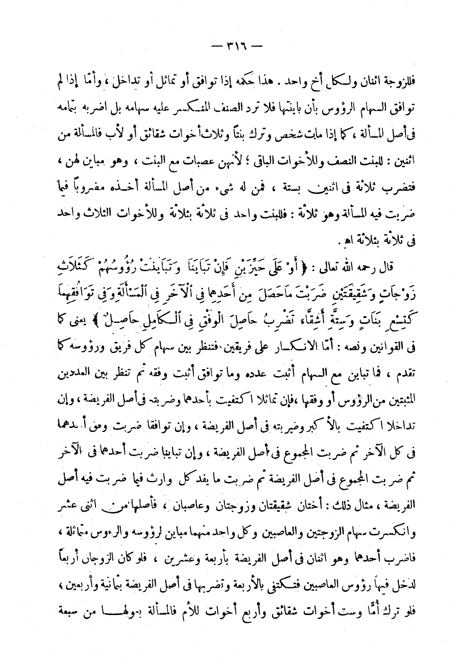 واحد. هذا حكمه إذا توافق أو تماثل أو تداخل، وأما إذا لم توافق السهام الرؤوس بأن باينتها فلا ترد الصنف المنكسر عليه سهامه بل اضربه بتمامه في أصل المسألة، كما إذا مات شخص وترك بنتًا وثلاث أخوات شقائق أو لب فالمسألة من اثنين: للبنت النصف وللأخوات الباقي؛ لأنهن عصبات مع البنت، وهو مباين لهن، فتضرب ثلاثة في اثنين بستة، فمن له شيء من أصل المسألة أخذه مضروبًا فيما ضربت فيه المسألة وهو ثلاثة: فللبنت واحد في ثلاثة بثلاثة وللأخوات الثلاث واحد في ثلاثة بثلاثة اهـ.