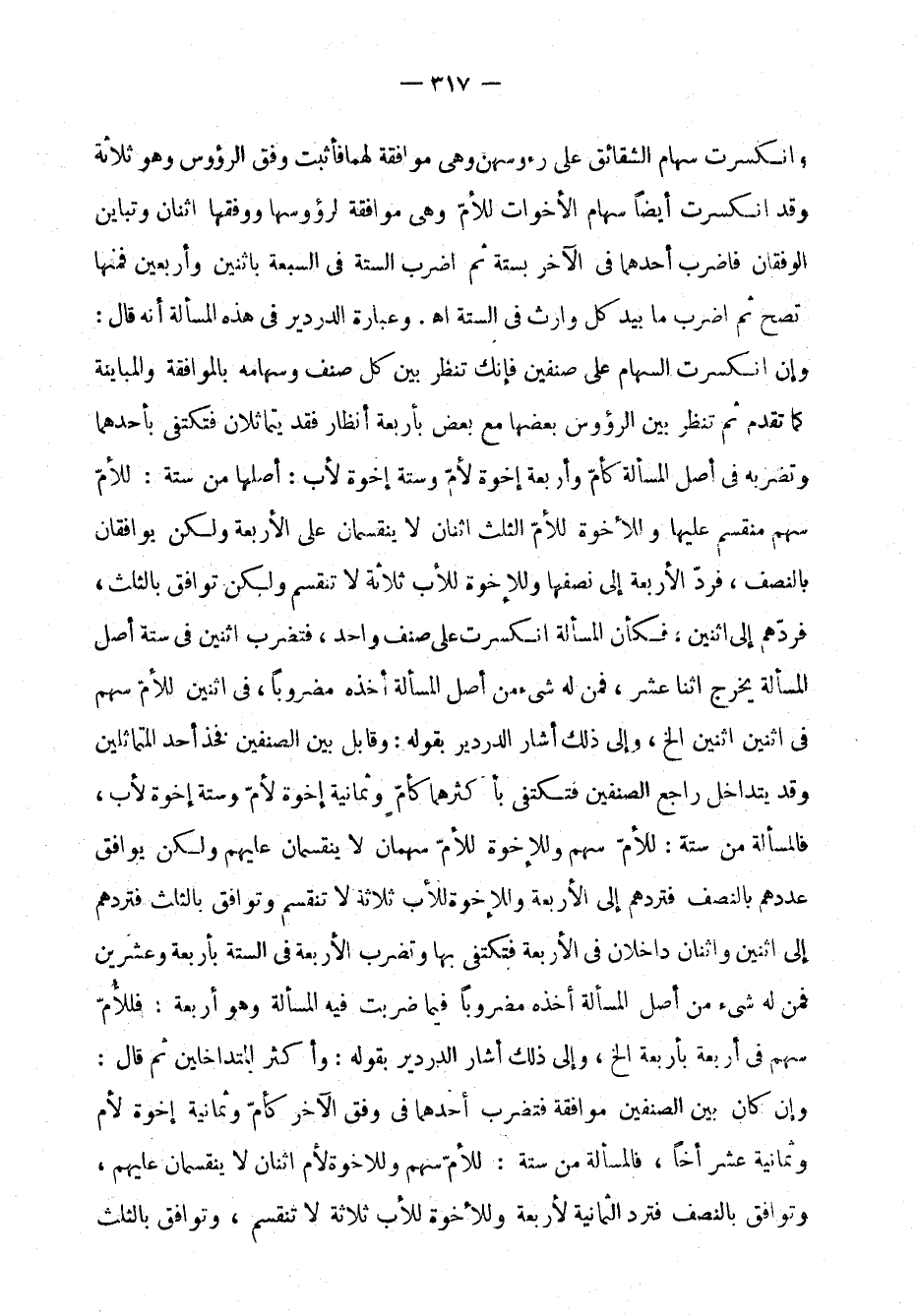 وانكسرت سهام الشقائق على رؤوسهن وهي موافقة لهما فأثبت وفق الرؤوس وهو ثلاثة وقد انكسرت أيضًا سهام الأخوات للأم وهي موافقة لرؤوسها ووفقها اثنان وتباين الوفقان فاضرب أحدهما في الآخر بستة ثم اضرب الستة في السبعة باثنين وأربعين فمنها تصح ثم اضرب ما بيد كل وارث في الستة اهـ. وعبارة الدردير في هذه المسألة أنه قال: وإن انكسرت السهام على صنفين فإنك تنظر بين كل صنف وسهامه بالموافقة والمباينة كما تقدم ثم تنظر بين الرؤوس بعضها مع بعض بأربعة أنظار فقد يتماثلان فتكتفي بأحدهما وتضربه في أصل المسألة كأم وأربعة إخوة لأم وستة إخوة لأب: أصلها من ستة: للأم سهم منقسم عليها وللأخوة للأم الثلث