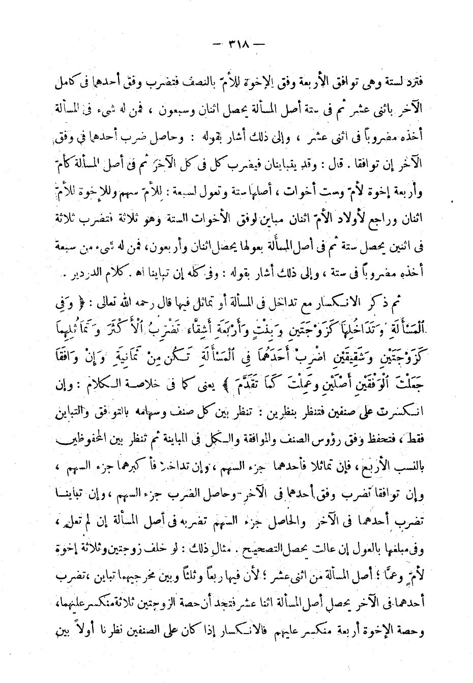 فترد لستة وهي توافق الأربعة وفق الإخوة للأم بالنصف فتضرب وفق أحدهما في كامل الآخر باثني عشر في ستة أصل المسألة يحصل اثنان وسبعون، فمن له شيء في المسألة أخذه مضروبًا في اثني عشر، وإلى ذلك أشار بقوله: وحاصل ضرب أحدهما في وفق الآخر إن توافقا. قال: وقد يتباينان فيضرب كل في كل الآخر ثم في أصل المسألة كأم وأربعة إخوة لأم وست أخوات، أصلها ستة وتعول لسبعة: للأم سهم وللإخوة للأم اثنان وراجع لأولاد ألم اثنان مباين لوفق الأخوات الست وهو ثلاثة فتضرب ثلاثة في اثنين يحصل ستة ثم في أصل المسألة بعولها يحصل اثنان وأربعون، فمن له شيء من سبعة أخذه مضروبًا في ستة، وإلى ذلك أشار بقوله: وفي كله إن تباينا اهـ. كلام الدردير.