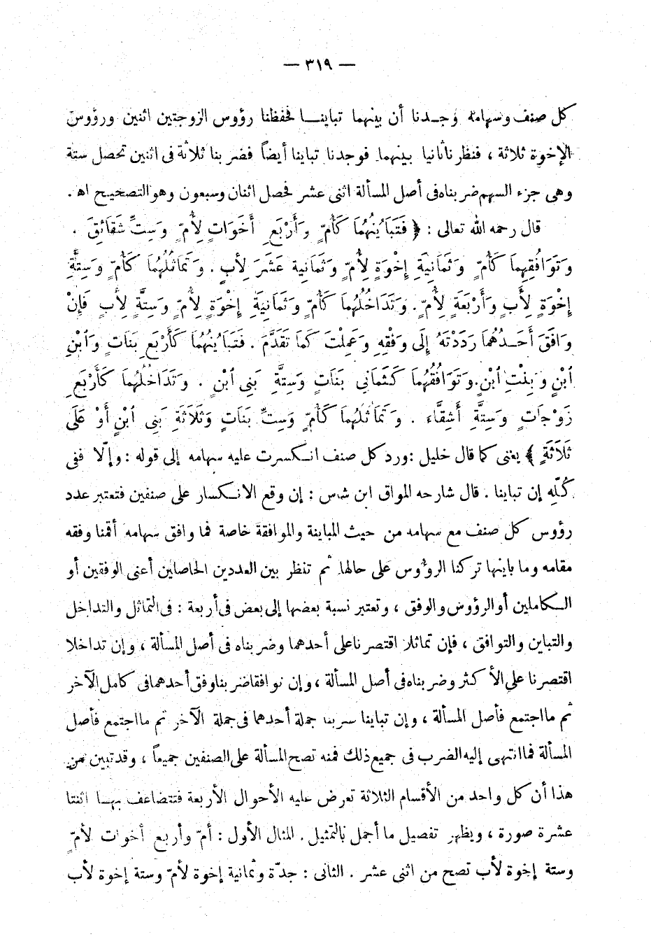 كل صنف وسهامه وجدنا أن بينهما تباينًا فحفظنا رؤوس الزوجتين اثنين ورؤوس الإخوة ثلاثة، فنظرنا ثانيًا بينهما فوجدنا تباينًا أيضًا فضربنا ثلاثة في اثنين تحصل ستة وهي جزء السهم ضربناه في أصل المسألة اثني عشر فحصل اثنان وسبعون وهو التصحيح اهـ.