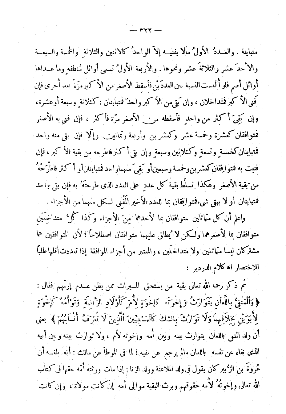 متباينة. والعدد الأول ما لا يفنيه إلا الواحد كالاثنين والثلاثة والخمسة والسبعة والأحد عشر والثلاثة عشر ونحوها. والأربعة تسمى أوائل منطفه وما عداها أوائل أصم فلو ألبست النسبة بين العددين فأسقط الأصغر من الأكبر مرة بعد أخرى فإن فني الأكبر فمتداخلان، وإن بقي من الأكبر واحد فمتباينان: كثلاثة وسبعة أو عشرة، وإن بقي أكثر من واحد فأسقطه من الأصغر مرة فأكثر، فإن فني به الأصغر فمتوافقان كعشرة وخمسة عشر وكعشرين وأربعة وثمانين وإلا فإن بقي منه واحد فمتباينان كخمسة وتسعة وكثلاثين وسبعة وإن بقي أكثر فاطرحه من بقية الأكبر، فإن فنيت به فمتوافقان كعشرين وخمسة وسبعين أو بقي منهما واحد فمتباينان أو أكثر فاطرحه من بقية الأصغر وهكذا تسلط بقية كل عدد على العدد الذي طرحته به فإن بقي واحد فمتباينان أو لا يبقى شيء فمتوافقان بما للعدد الأخير المفني لكل منهما من الأجزاء.
