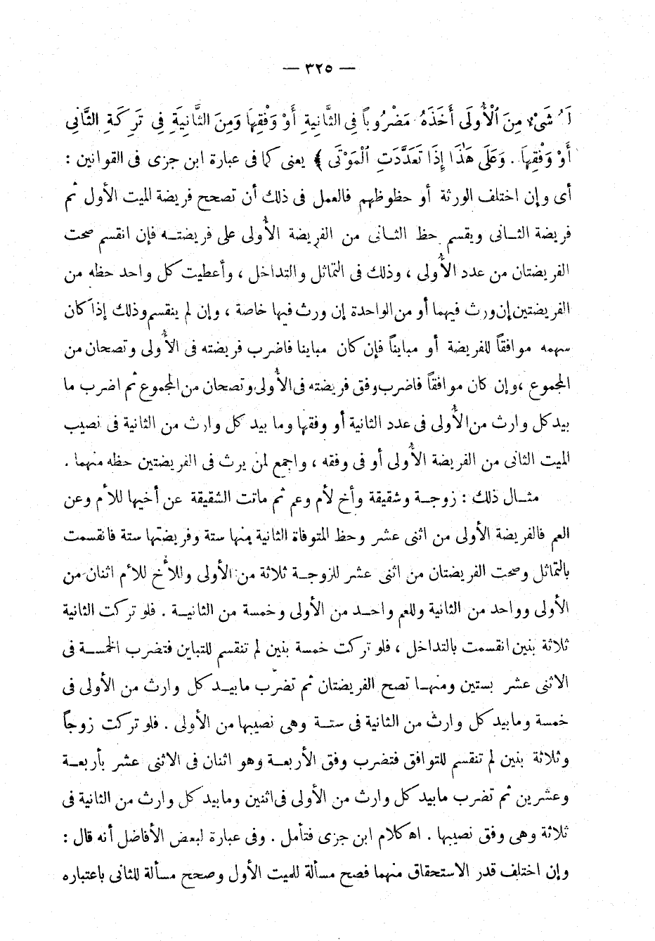 مثال ذلك: زوجة وشقيقة وأخ لأم وعم ثم ماتت الشقيقة عن أخيها للأم وعن العم فالفريضة الأولى من اثني عشر وحظ المتوفاة الثانية منها ستة وفريضتها ستة فانقسمت بالتماثل وصحت الفريضتان من اثني عشر للزوجة ثلاثة من الأولى وللأخ اثنان من الأولى وواحد من الثانية وللعم واحد من الأولى وخمسة من الثانية. فلو تركت الثانية ثلاثة بنين انقسمت بالتداخل، فلو تركت خمسة بنين لم تنقسم للتباين فتضرب الخمسة في الاثني عشر بستين ومنها تصح الفريضتان ثم تضرب ما بيد كل وارث من الأولى في خمسة وما بيد كل وارث من الثانية في ستة وهي نصيبها من الأولى. فلو تركت زوجًا وثلاثة بنين لم تنقسم للتوافق فتضرب وفق الأربعة وهو اثنان في الاثني عشر بأربعة وعشرين ثم تضرب ما بيد كل وارث من الأولى في اثنين وما بيد كل وارث من الثانية في ثلاثة وهي وفق نصيبها اهـ. كلام ابن جزي فتأمل. وفي عبارة لبعض الأفاضل أنه قال: وإن اختلف قدر الاستحقاق منهما فصح مسألة للميت الأول وصحح مسألة للثاني باعتباره