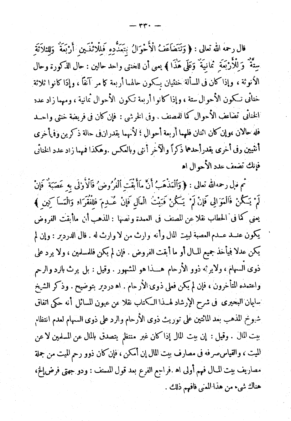 ثم قال رحمه الله تعالى: (والمذهب أن ما أبقت الفروض فالأولى به عصبة فإن لم يكن فالموالي فإن لم يكن فبيت المال فإن عدم فللفقراء والمساكين)، يعني كما في الحطاب نقلاً عن المصنف في العمدة ونصها: المذهب أن ما أبقت الفروض يكون عند عدم العصبة لبيت المال وأنه وارث من لا وارث له. قال الدردير: وإن لم يكن عدلاً فيأخذ جميع المال أو ما أبقت الفروض. فإن لم يكن فللمسلمين، ولا يرد على ذوي السهام، ولا يرثه ذوو الأرحام هذا هو المشهور. وقيل: بل يرث بالرد والرحم واعتمده المتأخرون، فإن لم يكن فعلى ذوي الأرحام. اهـ. الدردير بتوضيح. وذكر الشيخ سليمان البحيري في شرح الإرشاد لهذا الكتاب نقلاً عن عيون المسائل أنه حكى اتفاق شيوخ المذهب بعد المائتين على توريث ذوي الأرحام والرد على ذوي السهام لعدم انتظام بيت المال. وقيل: