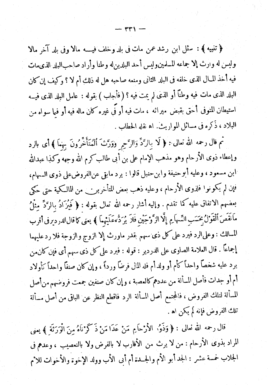 تنبيه: سئل ابن رشد عمن مات في بلد وخلف فيه مالاً وفي بلد آخر مالاً وليس له وارث إلا جماعة المسلمين وليس أحد البلدين له وطنًا وأراد صاحب البلد الذي مات فيه أخذ المال الذي خلفه في البلد الثاني ومنعه صاحبه هل له ذلك أم لا؟ وكيف إن كان البلد الذي مات فيه وطنًا أو الذي لم يمت فيه؟ فأجاب بقوله: عامل البلد الذي فيه استيطان المتوفى أحق بقبض ميراثه، مات فيه أو في غيره كان ماله فيه أو فيما سواه من البلاد، ذكره في مسائل المواريث. اهـ. نقله الحطاب.