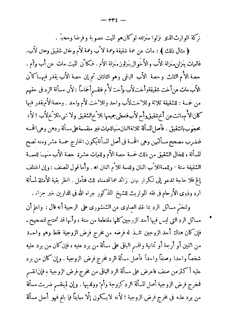 ولنختم مسائل الرد بما نقله الصاوي عن الشنشوري على الرحبية أنه قال: واعلم أن مسائل الرد التي ليس فيها أحد الزوجين كلها مقتطعة من ستة، وأنها قد تحتاج لتصحيح، فإن كان هناك أحد الزوجين فخذ له فرضه من مخرج فرض الزوجية فقط وهو واحد من اثنين أو أربعة أو ثمانية واقسم الباقي على مسألة من