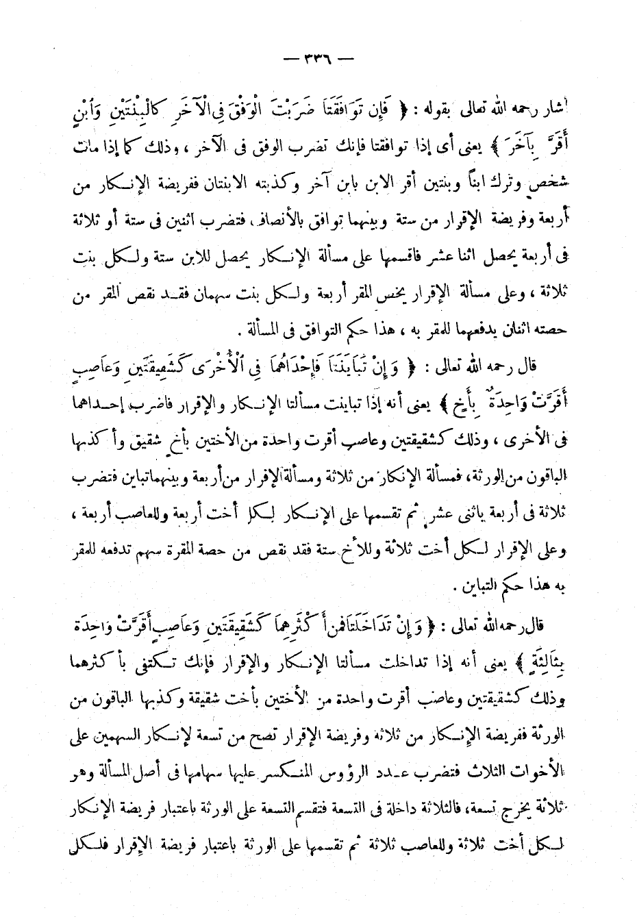 فتضرب اثنين في ستة أو ثلاثة في أربعة يحصل اثنا عشر فاقسمها على مسألة الإنكار يحصل للابن ستة ولكل بنت ثلاثة، وعلى مسألة الإقرار يخص المقر أربعة ولكل بنت سهمان فقد نقص المقر من حصته اثنان يدفعهما للمقر به، هذا حكم التوافق في المسألة.