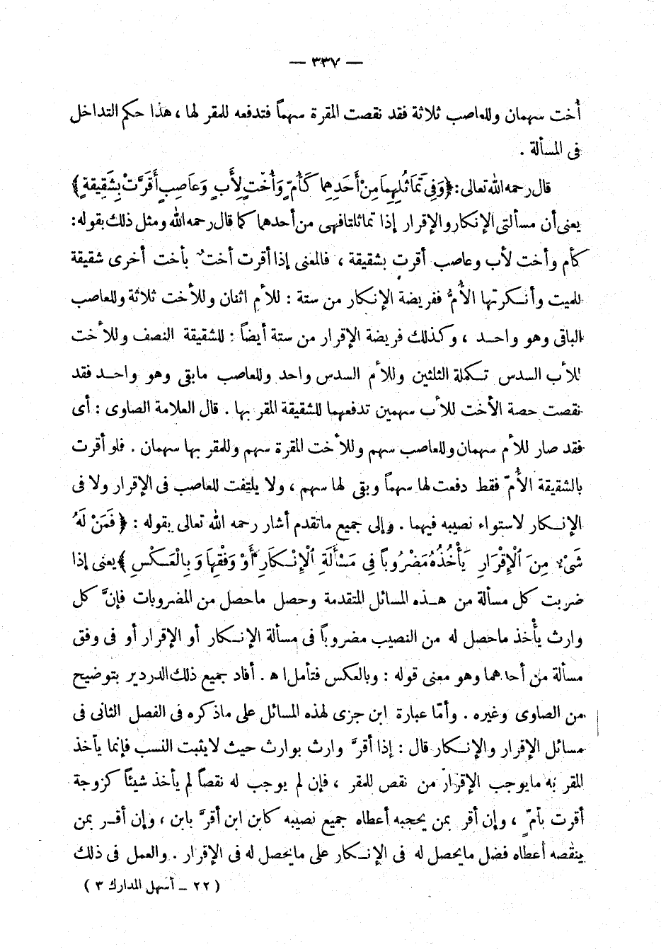 قال رحمه الله تعالى: (وفي تماثلهما من أحدهما كأم وأخت لأب وعاصب أقرت بشقيقة)، يعني أن مسألتي الإنكار والإقرار إذا تماثلتا فهي من أحدهما كما قال رحمه الله ومثل ذلك بقوله: كأم وأخت لأب وعاصب أقرت بشقيقة، فالمعنى إذا أقرت أخت بأخت أخرى شقيقة للميت وأنكرتها الأم ففريضة الإنكار من ستة: للأم اثنان وللأخت ثلاثة وللعاصب الباقي وهو واحد، وكذلك فريضة الإقرار من ستة أيضًا. للشقيقة النصف وللأخت للأب السدس تكملة الثلثين وللأم السدس واحد وللعاصب ما بقي وهو واحد فقد نقصت حصة الأخت للأب سهمين تدفعهما للشقيقة المقر بها. قال العلامة الصاوي: أي فقد صار للأم سهمان وللعاصب سهم وللأخت المقرة سهم وللمقر بها سهمان. فلو أقرت بالشقيقة الأم فقط دفعت لها سهمًا وبقي لها سهم، ولا يلتفت للعاصب في الإقرار ولا في الإنكار لاستواء