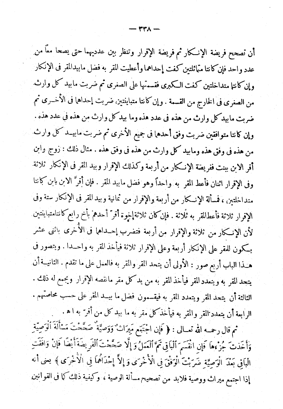 أن تصحح فريضة الإنكار ثم فريضة الإقرار وتنظر بين عدديهما حتى يصحا معًا من عدد واحد فإن كانتا متماثلتين كفت إحداهما وأعطيت المقر به فضل ما بيد المقر في الإنكار وإن كانتا متداخلتين كفت الكبرى فقسمتها على الصغرى ثم ضربت ما بيد كل وارث من الصغرى في الخارج من القسمة. وإن كانتا متباينتين ضربت إحداهما في الأخرى ثم ضربت ما بيد كل وارث من هذه في عدد هذه وما بيد كل وارث من هذه في عدد هذه. وإن كانتا متوافقتين ضربت وفق أحدهما في جميع الأخرى ثم ضربت ما بيد كل وارث من هذه في وفق هذه وما بيد كل وارث من هذه في وفق هذه. مثال ذلك: زوج وابن أقر الابن ببنت ففريضة الإنكار من أربعة وكذلك الإقرار وبيد المقر في الإنكار ثلاثة وفي الإقرار اثنان فأعط المقر به واحدًا وهو فضل ما بيد المقر، فإن أقر الابن بابن كانتا متداخلتين، فمسألة الإنكار من أربعة والإقرار من ثمانية وبيد المقر في الإنكار ستة وفي الإقرار ثلاثة فأعط المقر به ثلاثة، فإن كان ثلاثة إخوة أقر أحدهم بأخ رابع كانتا متباينتين لأن الإنكار من ثلاثة والإقرار من أربعة فتضرب إحداهما في الأخرى باثني عشر يكون للمقر على الإنكار أربعة وعلى الإقرار ثلاثة فيأخذ المقر به واحدًا، ويتصور في هذا الباب أربع صور: الأولى: أن يتحد المقر والمقر به فالعمل على ما تقدم. الثانية: أن يتحد المقر به ويتعدد المقر فيأخذ المقر به من يد كل مقر ما نقصه الإقرار ويجمع له ذلك. الثالثة: أن يتحد المقر ويتعدد المقر به فيقسمون فضل ما بيد المقر على حسب محاصتهم. الرابعة: أن يتعدد المقر والمقر به فيأخذ كل مقر به ما بيد كل من أقر به اهـ.