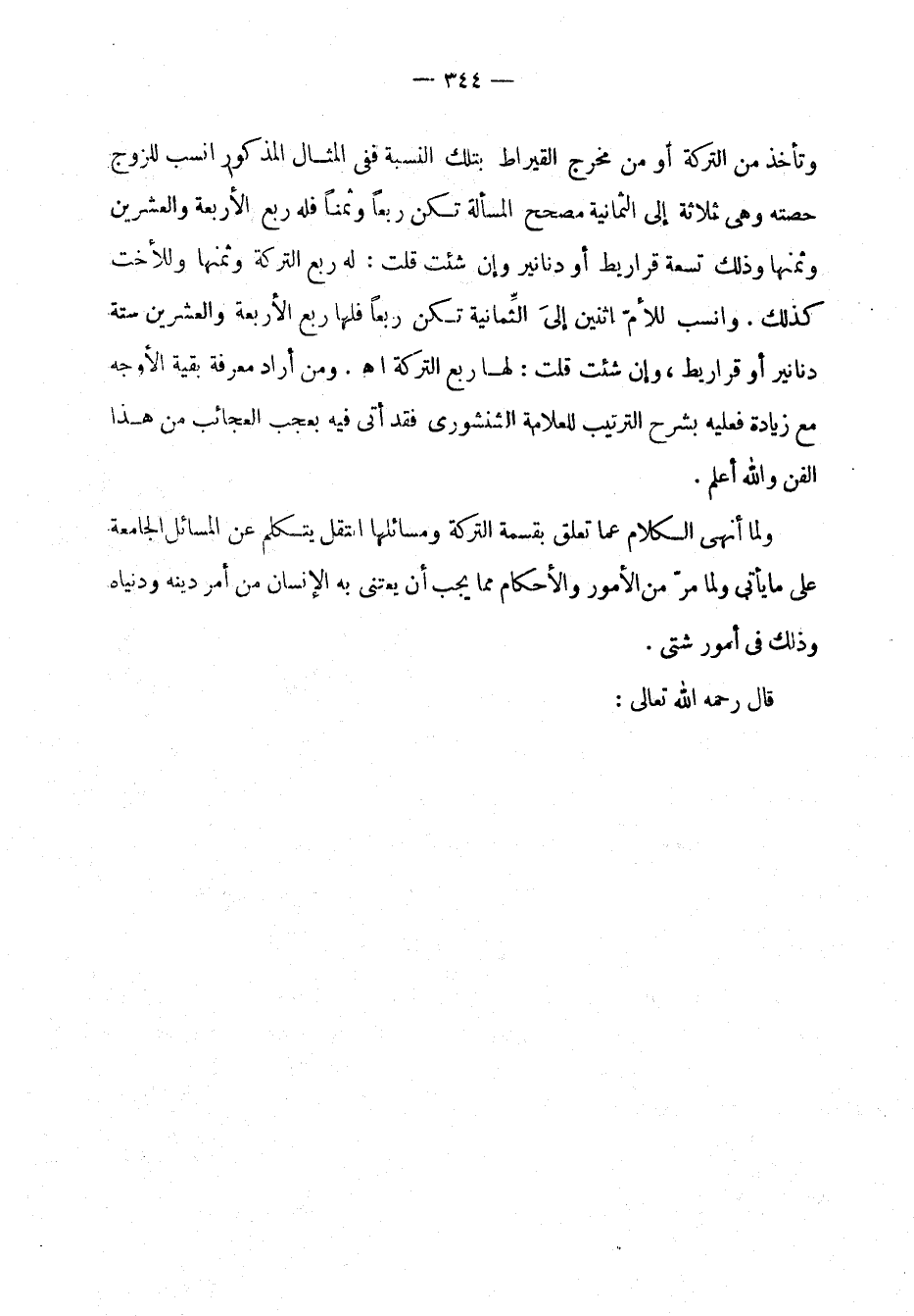 وتأخذ من التركة أو من مخرج القيراط بتلك النسبة ففي المثال المذكور انسب للزوج حصته وهي ثلاثة إلى الثمانية مصحح المسألة تكن ربعًا وثمنًا فله ربع الأربعة والعشرين وثمنها وذلك تسعة قراريط أو دنانير وإن شئت قلت: له ربع التركة وثمنها وللأخت كذلك. وانسب للأم اثنين إلى الثمانية تكن ربعًا فلها ربع الأربعة والعشرين ستة دنانير أو قراريط، وإن شئت قلت: لها ربع التركة اهـ. ومن أراد معرفة بقية الأوجه مع زيادة فعليه بشرح الترتيب للعلامة الشنشوري فقد أتى فيه بعجب العجائب من هذا الفن، والله أعلم.