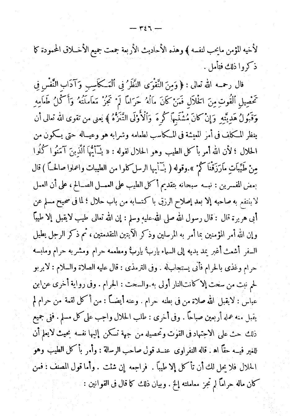 لأخيه المؤمن ما يحب لنفسه))، وهذه الأحاديث الأربعة جمعت جميع الأخلاق المحمودة كما ذكروا ذلك فتأمل.