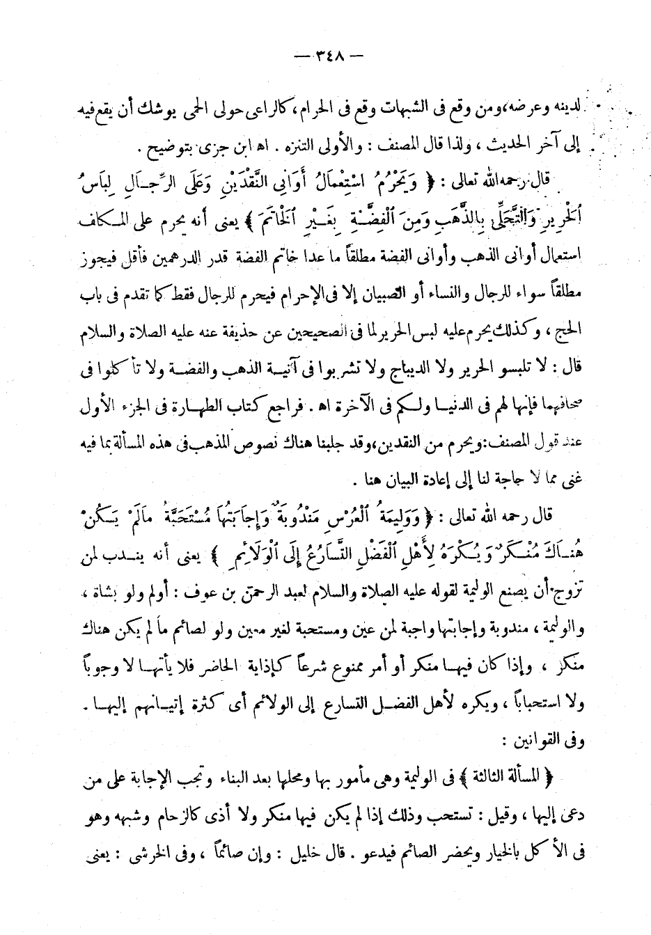 قال رحمه الله تعالى: (ووليمة العرس مندوبة وإجابتها مستحبة ما لم يكن هناك منكر ويكره لأهل الفضل التسارع إلى الولائم)، يعني أنه يندب لمن تزوج أن يصنع الوليمة لقوله عليه الصلاة والسلام لعبد الرحمن بن عوف: ((أولم ولو بشاة))، والوليمة مندوبة وإجابتها واجبة لمن عين ومستحبة لغير معين ولو لصائم ما لم يكن هناك منكر، وإذا كان فيها منكر أو أمر ممنوع شرعًا كإذاية الحاضر فلا يأتها لا وجوبًا ولا استحبابًا، ويكره لأهل الفضل التسارع إلى الولائم أي كثرة إتيانهم إليها. وفي القوانين: