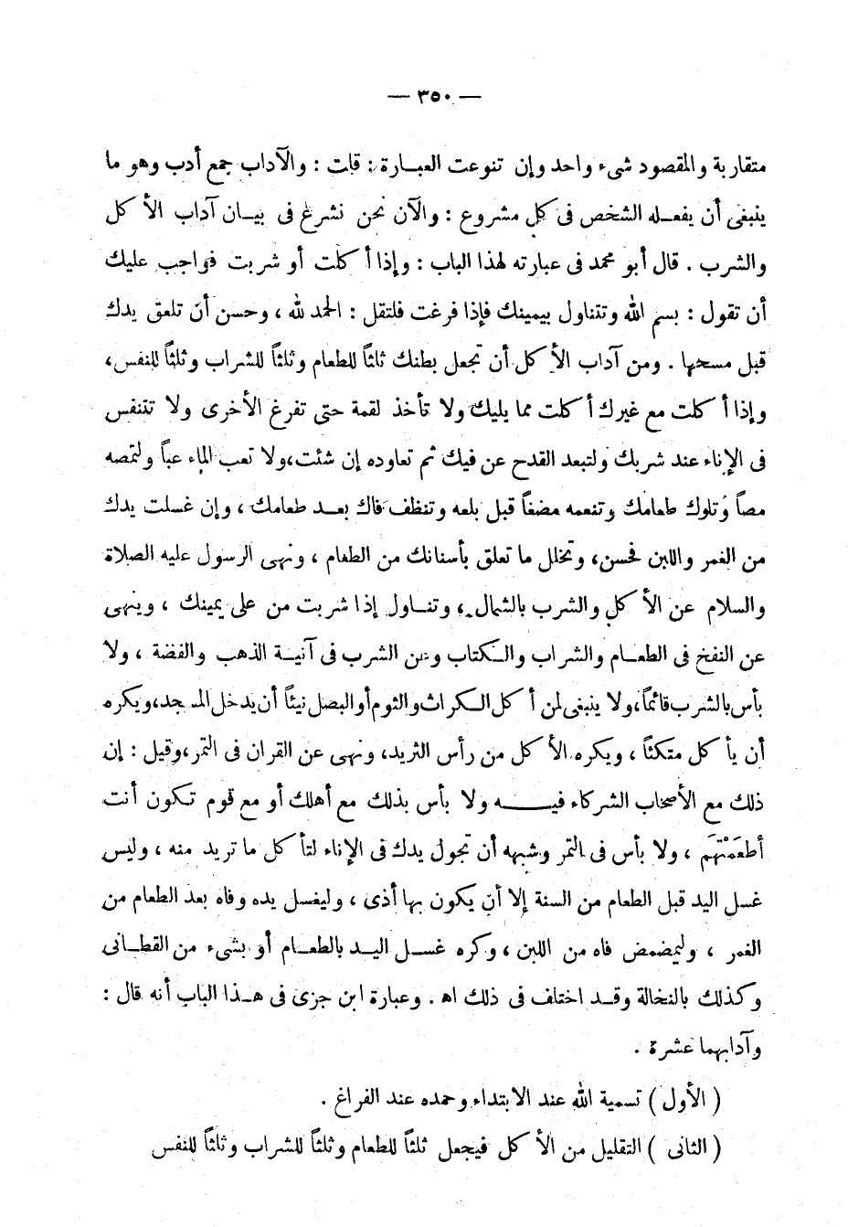 أن تعلق يدك قبل مسحها. ومن آداب الأكل أن تجعل بطنك ثلثًا للطعام وثلثًا للشراب ولثلثًا للنفس، وإذا أكلت مع غيرك أكلت مما يليك ولا تأخذ لقمة حتى تفرغ الأخرى ولا تتنفس في الإناء عند شربك ولتبعد القدح عن فيك ثم تعاوده إن شئت، ولا تعب الماء عبًا ولتمصه مصًا وتلوك طعامك وتنعمه مضغًا قبل بلعه وتنظف فاك بعد طعامك، وإن غسلت يدك من الغمر واللبن فحسن، وتخلل ما تعلق بأسنانك من الطعام، ونهى الرسول عليه والصلاة والسلام عن الأكل والشرب بالشمال، وتناول إذا شربت من على يمينك، وينهى عن النفخ في الطعام والشراب والكتاب وعن الشرب في آنية الذهب والفضة، ولا بأس بالشرب قائمًا، ولا ينبغي لمن أكل الكراث والثوم أو البصل نيئًا أن يدخل المسجد، ويكره أن يأكل متكئًا، ويكره الأكل من رأس الثريد، ونهى عن القران في التمر، وقيل: إن ذلك مع الأصحاب الشركاء فيه ولا بأس بذلك مع أهلك أو مع قوم تكون أنت أطعمتهم، ولا بأس في التمر وشبهه أن تجول يدك في الإناء لتأكل ما تريد منه، وليس غسل اليد قبل الطعام من السنة إلا أن يكون بها أذى، وليغسل يده وفاه بعد الطعام من الغمر، وليمضمض فاه من اللبن، وكره غسل اليد بالطعام أو بشيء من القطاني وكذلك بالنخالة وقد اختلف في ذلك اهـ. وعبارة ابن جزي في هذا الباب أنه قال: وآدابهما عشرة.