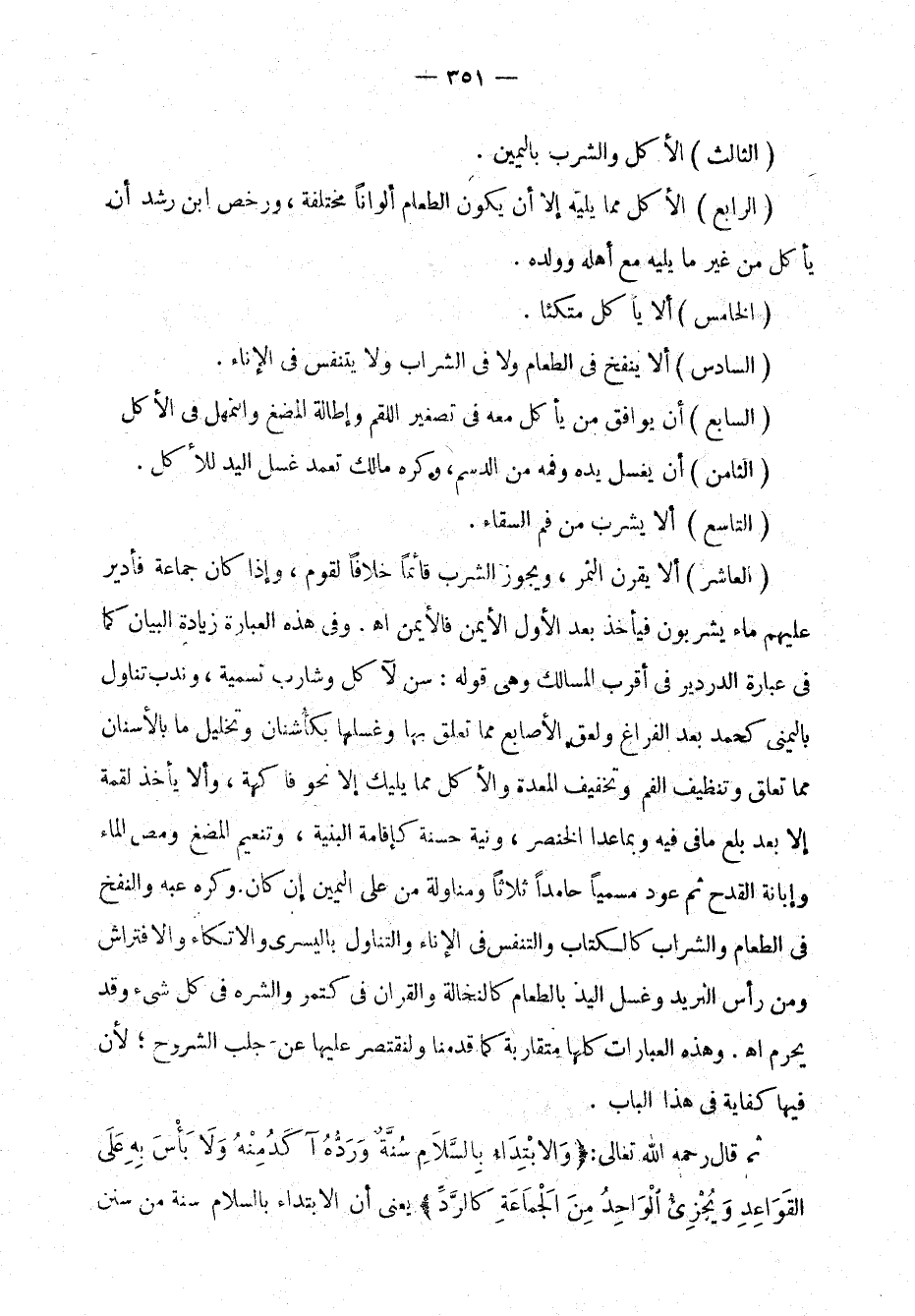 العاشر: ألا يقرن التمر، ويجوز الشرب قائمًا خلافًا لقوم، وإذا كان جماعة فأدير عليهم ماء يشربون فيأخذ بعد الأول الأيمن فالأيمن اهـ. وفي هذه العبارة زيادة البيان كما في عبارة الدردير في أقرب المسالك وهي قوله: سن لآكل وشارب