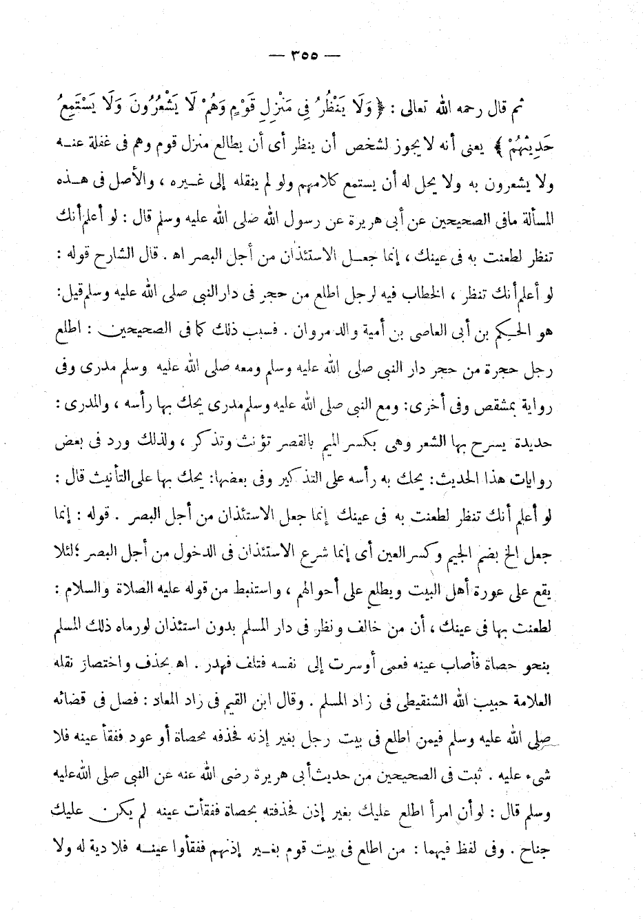 ثم قال رحمه الله تعالى: (ولا ينظر في منزل قوم وهم لا يشعرون ولا يستمع حديثهم)، يعني أنه لا يجوز لشخص أن ينظر أي أن يطالع منزل قوم وهم في غفلة عنه ولا يشعرون به ولا يحل له أن يستمع كلامهم ولو لم ينقله إلى غيره، والأصل في هذه المسألة ما في الصحيحين عن أبي هريرة عن رسول الله صلى الله عليه وسلم قال: ((لو أعلم أنك تنظر لطعنت به في عينيك، إنما جعل الاستئذان من أجل البصر)) اهـ. قال الشارح: قوله: ((لو أعلم أنك تنظر)) الخطاب فيه لرجل اطلع من حجر في دار النبي صلى الله عليه وسلم قيل: هو الحكم بن أبي العاص بن أمية والد مروان. فسبب ذلك كما في الصحيحين: اطلع رجل في حجرة من حجر دار النبي صلى الله عليه وسلم ومعه صلى الله عليه وسلم مدرى وفي رواية بمشقص وفي أخرى: ومع النبي صلى الله عليه وسلم مدرى يحك بها رأسه، والمدرى: حديدة يسرح بها الشعر وهي بكسر الميم بالقصر تؤنث وتذكر، ولذلك ورد في بعض روايات هذا الحديث: يحك به رأسه، على التذكير وفي بعضها: يحك بها، على التأنيث، قال: ((لو أعلم أنك تنظر لطعنت به في عينك، إنما جعل الاستئذان من أجل البصر))، قوله: ((إنما جعل ...)) إلخ، بضم الجيم وكسر العين أي إنما شرع الاستئذان
