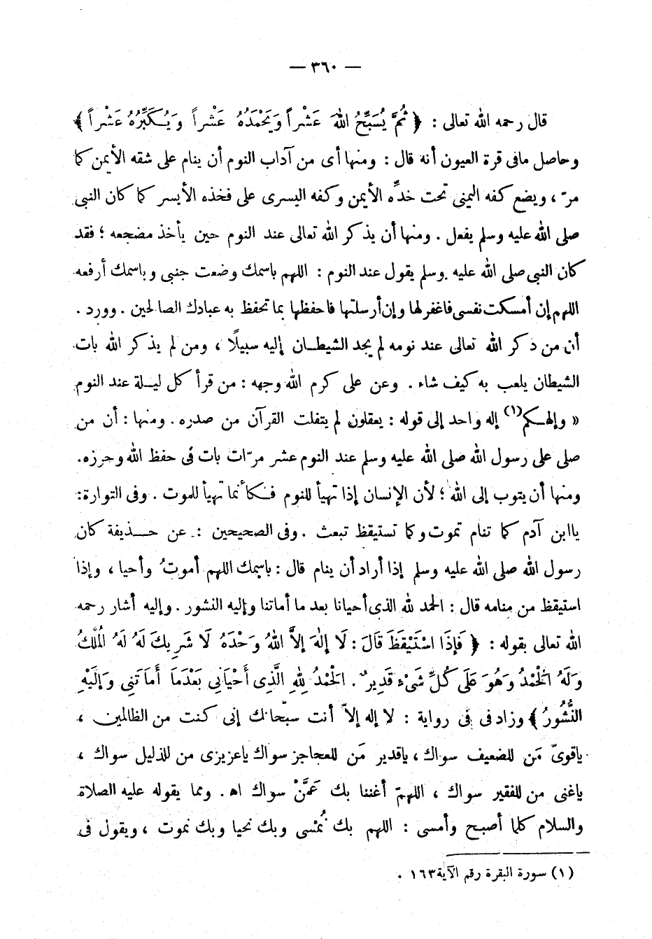 قال رحمه الله تعالى: (ثم يسبح الله عشرًا ويحمده عشرًا ويكبره عشرًا)، وحاصل ما في قرة العيون أنه قال: ومنها أي من آداب النوم أن ينام على شقه الأيمن كما مر، ويضع كفه اليمنى تحت خده الأيمن وكفه اليسرى على فخذه الأيسر كما كان النبي صلى الله عليه وسلم يفعل. ومنها أن يذكر الله تعالى عند النوم حين يأخذ مضجعه، فقد كان النبي صلى الله عليه وسلم يقول عند النوم: (اللهم باسمك وضعت جنبي وباسمك أرفعه اللهم إن أمسكت نفسي فاغفر لها وإن أرسلتها فاحفظها بما تحفظ به عبادك الصالحين))، وورد أن من ذكر الله تعالى عند نومه لم يجد الشيطان إليه سبيلاً، ومن لم يذكر الله بات الشيطان يلعب به كيف شاء. وعن علي كرم الله وجهه: من قرأ كل ليلة عند النوم: {وإلهاكم إله واحد} إلى قوله: {يعقلون} [البقرة: 163] لم يتفلت القرآن من صدره. ومنها أن من صلى على رسول الله صلى الله عليه وسلم عند النوم عشر مرات بات في حفظ الله وحرزه. ومنها أن يتوب إلى الله؛ لأن الإنسان إذا تهيأ للنوم فكأنما تهيأ للموت. وفي التوراة: يا ابن آدم كما تنام تموت وكما تستيقظ تبعث. وفي الصحيحين عن حذيفة كان رسول الله صلى الله عليه وسلم إذا أراد أن ينام قال: ((باسمك اللهم أموت وأحيا))، وإذا استيقظ من منامه قال: ((الحمد لله الذي أحيانا بعدما أماتنا وإليه النشور)). وإليه أشار رحمه الله تعالى بقوله: (فإذا استيقظ قال: لا إله إلا الله وحده لا شريك له له الملك وله الحمد وهو على كل شيء قدير، الحمد لله الذي أحياني بعدما أماتني وإليه النشور). وزاد في رواية: لا إله إلا أنت سبحانك إني كنت من الظالمين، يا قوي من للضعيف سواك، يا قدير من للعاجز سواك، يا عزيز من للذليل سواك، يا غني من للفقير سواك، اللهم أغننا بك عمن سواك اهـ. ومما يقوله عليه الصلاة والسلام كلما أصبح وأمسى: ((اللهم بك نمسي وبك نحيا وبك نموت))، ويقول في