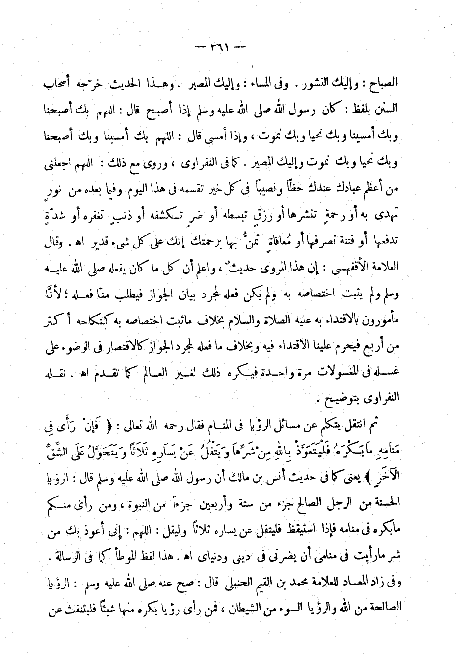 قال: ((اللهم بك أمسينا وبك أصبحنا وبك نحيا وبك نموت وإليك المصير))، كما في النفراوي، وروى مع ذلك: اللهم اجعلني من أعظم عبادك عندك حظًا ونصيبًا في كل خير تقسمه في هذا اليوم وفيما بعده من نور تهدي به أو رحمة تنشرها أو رزق تبسطه أو ضر تكشفه أو ذنب تغفره أو شدة تدفعها أو فتنة تصرفها أو معافاة تمن بها برحمتك إنك على كل شيء قدير. اهـ. وقال العلامة الأقفهسي: إذن هذا المروي حديث، واعلم أن كل ما كان يفعله صلى الله عليه وسلم ولم يثبت اختصاصه به ولم يكن فعله لمجرد بيان الجواز فيطلب منا فعله؛ لأنا مأمورون بالاقتداء به عليه الصلاة والسلام بخلاف ما ثبت اختصاصه به كنكاحه أكثر من أربع فيحرم علينا الاقتداء فيه وبخلاف ما فعله لمجرد الجواز كالاقتصار في الوصوء على غسله في المغسولات مرة واحدة فيكره ذلك لغير العالم كما تقدم اهـ. نقله النفراوي بتوضيح.
