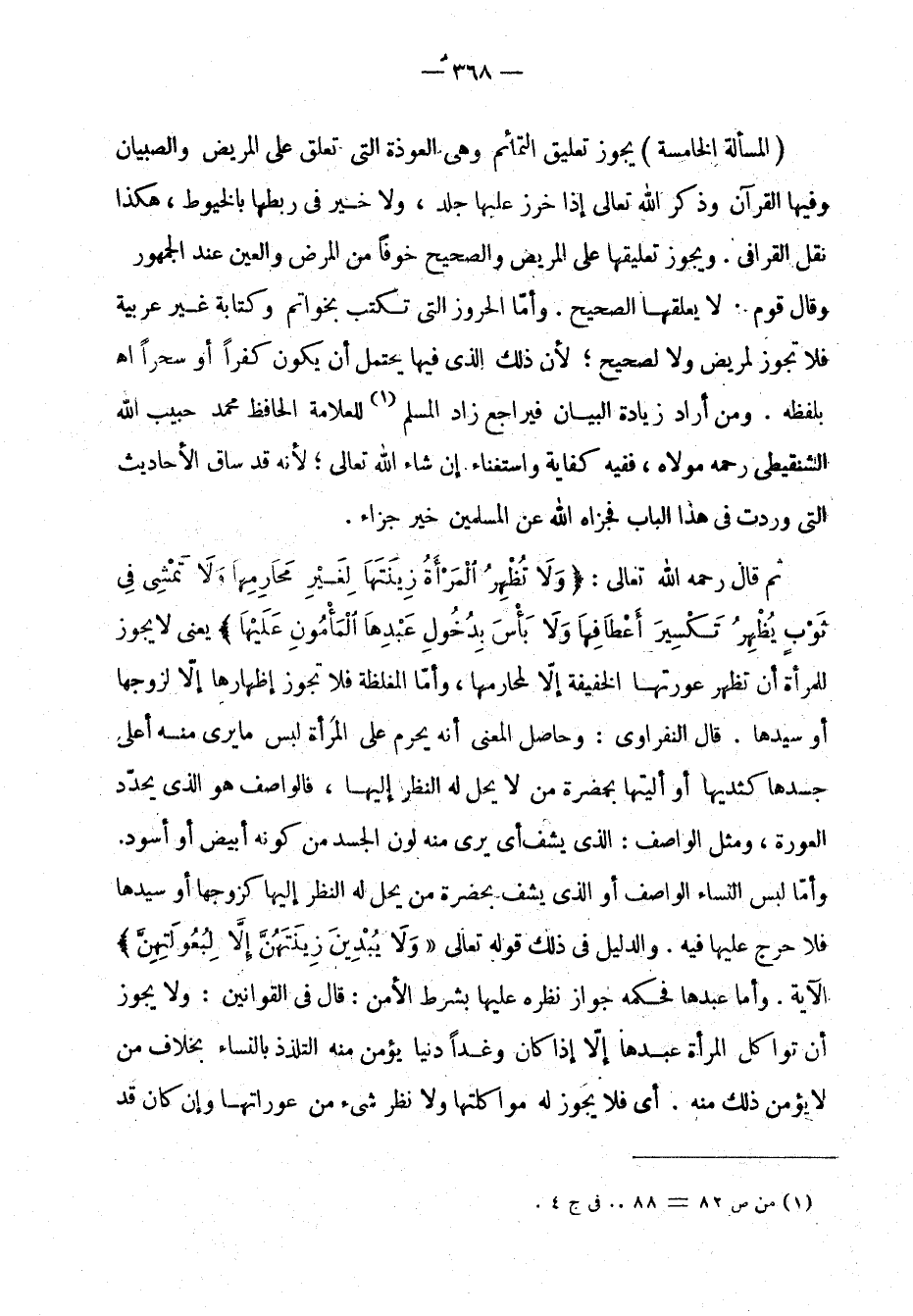 المسألة الخامسة: يجوز تعليق التمائم وهي العوذة التي تعلق على المريض والصبيان وفيها القرآن وذكر الله تعالى إذا خرز عليها جلد، ولا خير في ربطها بالخيوط، هكذا نقل القرافي. ويجوز تعليقها على المريض والصحيح خوفًا من المرض والعين عند الجمهور وقال قوم: لا يعلقها الصحيح. وأما الحروز التي تكتب بخواتم وكتابة غير عربية فلا تجوز لمريض ولا لصحيح؛ لأن ذلك الذي فيها يحتمل أن يكون كفرًا أو سحرًا اهـ. بلفظه. ومن أراد زيادة البيان فيراجع زاد المسلم (¬1) للعلامة الحافظ محمد حبيب الله الشنقيطي رحمه مولاه، ففيه كفاية واستغناء إن شاء الله تعالى؛ لأنه قد ساق الأحاديث التي وردت في هذا الباب فجزاه الله عن المسلمين خير جزاء.