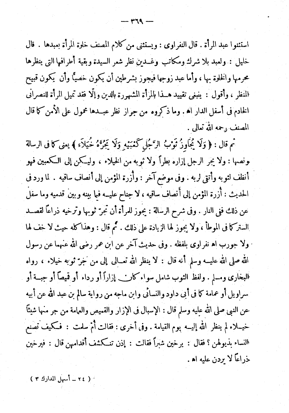 الرسالة ونصها: ولا يجر الرجل إزاره بطرًا ولا ثوبه من الخيلاء، وليكن إلى الكعبين فهو أنظف لثوبه وأتقى لربه. وفي موضع آخر: وأزرة المؤمن إلى أنصاف ساقيه. لما ورد في الحديث: أزروة المؤمن إلى أنصاف ساقيه، لا جناح عليه فيما بينه وبين قدميه وما سفل عن ذلك ففي النار. وفي شرح الرسالة: يجوز للمرأة أن تجر ثوبها وترخيه ذراعًا لقصد الستر كما في الموطأ، ولا يجوز لها الزيادة على ذلك. ثم قال: وهذا كله حيث لا خف لها ولا جورب اهـ. النفراوي بلفظه. وفي حديث آخر عن ابن عمر رضي الله عنهما، عن رسول الله صلى الله عليه وسلم أنه قال: ((لا ينظر الله تعالى إلى من جر ثوبه خيلاء))، رواه البخاري ومسلم. ولفظ الثوب شامل سواء كان إزارًا أو رداء أو قميصًا أو جبة أو سراويل أو عمامة كما في أبي داود والنسائي وابن ماجه من رواية سالم بن عبد الله عن أبيه عن النبي صلى الله عليه وسلم قال: ((الإسبال في الإزار والقميص والعمامة من جر منها شيئًا خيلاء لم ينظر الله إليه يوم القيامة))، وفي أخرى: فقالت أم سلمة: فكيف تصنع النساء بذيولهن؟ فقال: ((يرخين شبرًا))، فقالت: إذن تنكشف أقدامهن قال: ((فيرخين ذراعًا لا يردن عليه)) اهـ.