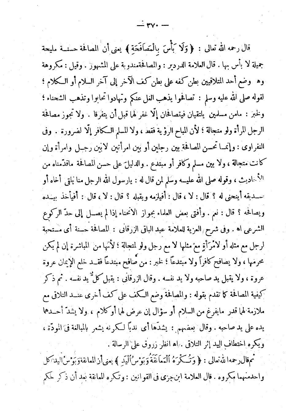 قال رحمه الله تعالى: (ولا باس بالمصافحة) يعني أن المصافحة حسنة مليحة جميلة لا بأس بها. قال العلامة الدردير: والمصافحة مندوبة على المشهور. وقيل: مكروهة وهو وضع أحد المتلاقيين بطن كفه على بطن كف الآخر إلى آخر السلام أو الكلام؛ لقوله صلى الله عليه وسلم: ((تصافحوا يذهب الغل عنكم وتهادوا تحابوا وتذهب الشحناء))، ولخبر: ما من مسلمين يلتقيان فيتصافحان إلا غفر لهما قبل أن يتفرقا. ولا تجوز مصافحة الرجل المرأة ولو متجالة؛ لأن المباح الرؤية فقط، ولا المسلم الكافر إلا لضرورة. وفي النفراوي: وإنما تحسن المصافحة بين رجلين أو بين امرأتين لا بين رجل وامرأة وإن كانت متجالة، ولا بين مسلم وكافر أو مبتدع. والدليل على حسن المصافحة ما قدمناه من الأحاديث، وقوله صلى الله عليه وسلم لمن قال له: يا رسول الله الرجل منا يلقى أخاه أو صديقه أينحني له؟ قال: ((لا))، قال: أفيلزمه ويقبله؟ قال: ((لا))، قال: أفيأخذ بيده ويصافحه؟ قال: ((نعم)). وأفتى بعض العلماء بجواز الانحناء إذا لم يصل إلى حد الركوع الشرعي. اهـ. وفي شرح العزية للعلامة عبد الباقي الزرقاني: المصافحة حسنة أي مستحبة لرجل مع مثله أو لامرأة مع مثلها لا مع رجل ولو لمتجالة؛ لأنها من المباشرة إن لم يكن محرمها، ولا يصافح كافرًا ولا مبتدعًا، لخبر: من صافح مبتدعًا فقد خلع الإيمان عروة عروة، ولا يقبل يد صاحبه ولا يد نفسه. وقال الزرقاني: يقبل كل يد نفسه. ثم ذكر كيفية المصافحة كما تقدم بقوله: والمصافحة وضع الكف على كف أخرى عند التلاقي مع ملازمة لهما قدر ما يفرغ من السلام أو سؤال إن عرض لهما أو كلام، ولا يشد