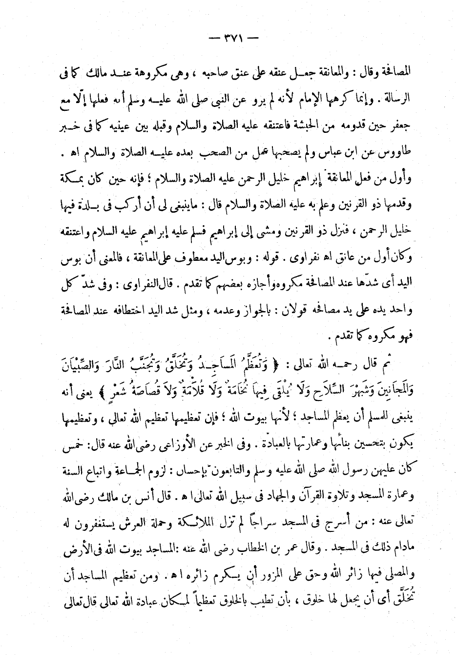 المصافحة وقال: والمعانقة جعل عنقه على عنق صاحبه، وهي مكروهة عند مالك كما في الرسالة. وإنما كرهها الإمام لأنه لم يرو عن النبي صلى الله عليه وسلم أنه فعلها إلا مع جعفر حين قدومه من الحبشة فاعتنقه عليه الصلاة والسلام وقبله بين عينيه كما في خبر طاوس عن ابن عباس ولم يصحبها عمل من الصحب بعده عليه الصلاة والسلام. اهـ. وأول من فعل المعانقة إبراهيم خليل الرحمن عليه الصلاة والسلام، فإنه حين كان بمكة وقدمها ذو القرنين وعلم به عليه الصلاة والسلام قال: ما ينبغي لي أن أركب في بلدة فيها خليل الرحمن، فنزل ذو القرنين ومشى إلى إبراهيم فسلم عليه إبراهيم عليه السلام واعتنقه وكان أول من عانق اهـ. النفراوي. قوله: وبوس اليد معطوف على المعانقة، فالمعنى أن بوس اليد أي شدها عند المصافحة مكروه وأجازه بعضهم كما تقدم. قال النفراوي: وفي شد كل واحد يده على يد مصافحه قولان: بالجواز وعدمه، ومثل شد اليد اختطافه عند المصافحة فهو مكروه كما تقدم.