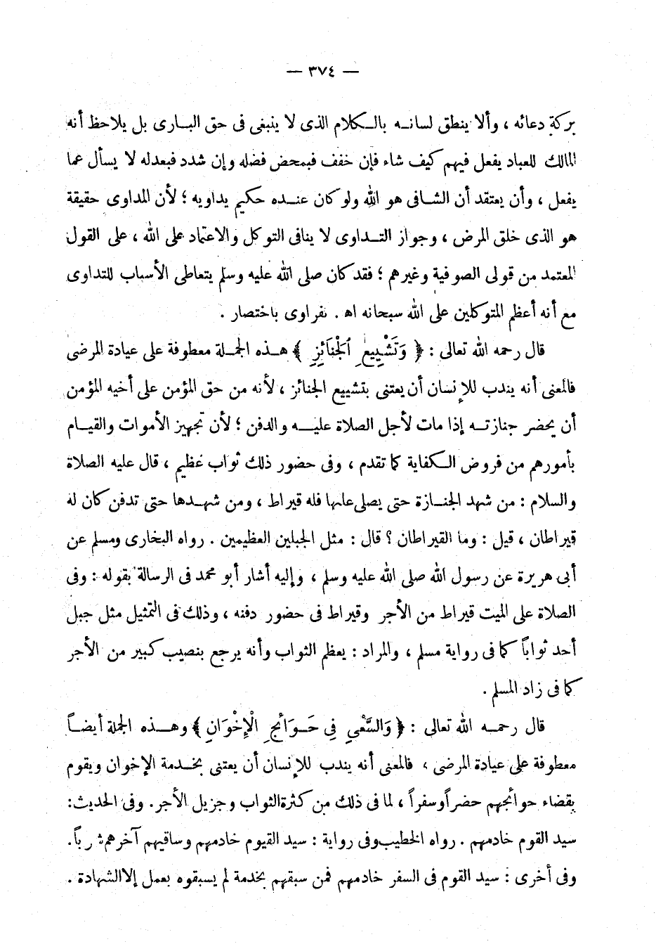 بركة دعائه، وألا ينطق لسانه بالكلام الذي لا ينبغي في حق الباري بل يلاحظ أنه المالك للعباد يفعل فيهم كيف شاء فإن خفف فبمحض فضله وإن شدد فبعدله لا يسأل عما يفعل، وأن يعتقد أن الشافي هو الله ولو كان عنده حكيم يداويه؛ لأن المداوي حقيقة هو الذي خلق المرض، وجواز التداوي لا ينافي التوكل والاعتماد على الله، على القول المعتمد من قول الصوفية وغيرهم، فقد كان صلى الله عليه وسلم يتعاطى الأسباب للتداوي مع أنه أعظم المتوكلين على الله سبحانه اهـ. النفراوي باختصار.