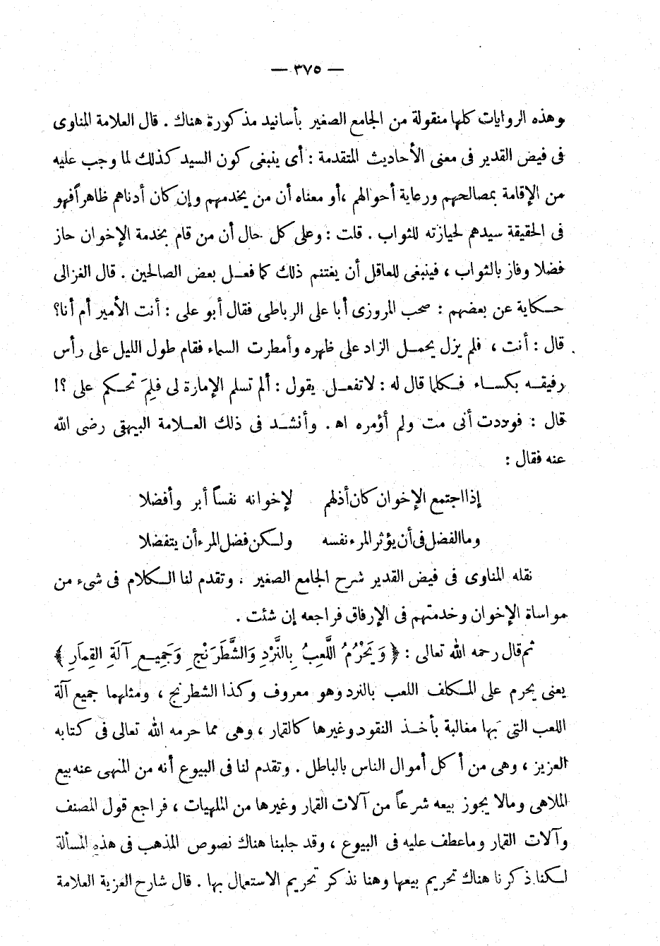 وهذه الروايات كلها منقولة من الجامع الصغير بأسانيد مذكورة هناك. قال العلامة المناوي في فيض القدير في معنى الأحاديث المتقدمة: أي ينبغي كون السيد كذلك لما وجب عليه من الإقامة بمصالحهم ورعاية أحوالهم، أو معناه أن من يخدمهم وإن كان أدناهم ظاهرًا فهو في الحقيقة سيدهم لحيازته للثواب. قلت: وعلى كل حال أن من قام بخدمة الإخوان حاز فضلاً وفاز بالثواب، فينبغي للعاقل أن يغتنم ذلك كما فعل بعض الصالحين. قال الغزالي حكاية عن بعضهم: صحب المروزي أبا علي الرباطي فقال أبو علي: أنت الأمير أم أنا؟ قال: أنت، فلم يزل يحمل الزاد على ظهره وأمطرت السماء فقام طول الليل على رأس رفيقه بكساء فكلما قال له: لا تفعل يقول: ألم تسلم الإمارة لي فلم تحكم علي؟! قال: فوددت أني مت ولم أؤمره اهـ. وأنشد في ذلك العلامة البيهقي، رضي الله عنه، فقال: