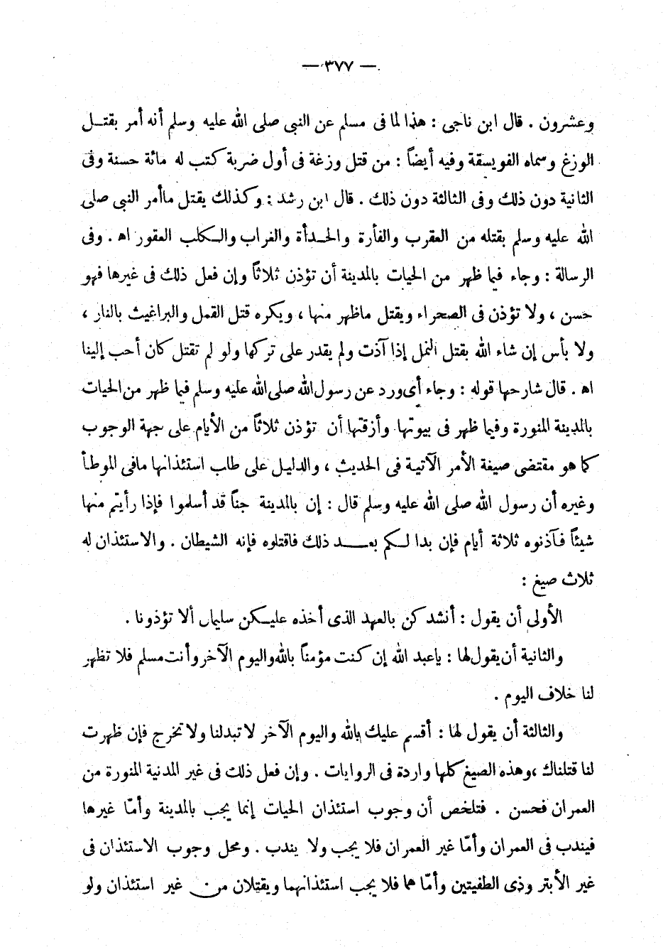 وعشرون. قال ابن ناجي: هذا لما في مسلم عن النبي صلى الله عليه وسلم أنه أمر بقتل الوزغ وسماه الفويسقة وفيه أيضًا: من قتل وزغة في أول ضربة كتب له مائة حسنة وفي الثانية دون ذلك وفي الثالثة دون ذلك. قال ابن رشد: وكذلك يقتل ما أمر النبي صلى الله عليه وسلم بقتله من العقرب والفأرة والحدأة والغراب والكلب العقور اهـ. وفي الرسالة: وجاء فيما ظهر من الحيات بالمدينة أن تؤذن ثلاثًا وإن فعل ذلك في غيرها فهو حسن، ولا تؤذن في الصحراء ويقتل ما ظهر منها، ويكره قتل القمل والبراغيث بالنار، ولا بأس إن شاء الله بقتل النمل إذا آذت ولم يقدر على تركها ولو لم تقتل كان أحب إلينا اهـ. قال شارحها قوله: وجاء أي ورد عن رسول الله صلى الله عليه وسلم فيما ظهر من الحيات بالمدينة المنورة وفيما ظهر في بيوتها وأزقتها أن تؤذن ثلاثة من الأيام على جهة الوجوب كما هو مقتضى صيغة الأمر الآتية في الحديث، والدليل على طلب استئذانها ما في الموطأ وغيره أن رسول الله صلى الله عليه وسلم قال: ((إن
