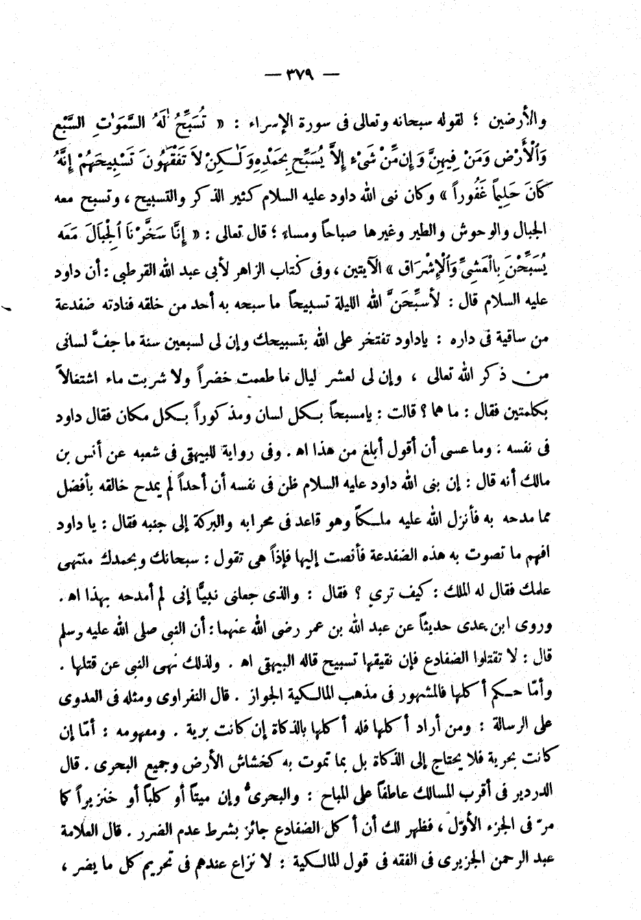 والأرضين؛ لقوله سبحانه وتعالى في سورة الإسراء: {تسبح له السموات السبع والأرض ومن فيهن وإن من شيء إلا يسبح بحمده ولكن لا تفقهون تسبيحهم إنه كان حليمًا غفورًا} [الإسراء: 44] وكان نبي الله داود عليه السلام كثير الذكر والتسبيح، وتسبح معه الجبال والوحوش والطير وغيرها صباحًا ومساء، قال تعالى: {إنا سخرنا الجبال معه يسبحن بالعشى والإشراق} [ص: 38] الآيتين، وفي كتاب الزاهر لأبي عبد الله القرطبي: أن داود عليه السلام قال: لأسبحن الله الليلة تسبيحًا ما سبحه به أحد من خلقه فنادته ضفدعة من ساقية في داره: يا داود تفتخر على الله بتسبيحك وإن لي لسبعين سنة ما جف لساني من ذكر الله تعالى، وإن لي لعشر ليال ما طعمت خضرًا ولا شربت ماء اشتغالاً بكلمتين، فقال: ما هما؟ قالت: يا مسبحًا بكل لسان ومذكورًا بكل مكان، فقال داود في نفسه: وما عسى أن أقول أبلغ من هذا اهـ. وفي رواية البيهقي في شعبه عن أنس بن مالك أنه قال: إن نبي الله داود عليه السلام ظن في نفسه أن أحدًا لم يمدح خالقه بأفضل مما مدحه به فأنزل الله عليه ملكًا وهو قاعد في محرابه والبركة إلى جنبه فقال: يا داود افهم ما تصوت به هذه الضفدعة فأنصت إليها فإذا هي تقول: سبحانك وبحمدك منتهى علمك، فقال له الملك: كيف ترى؟ فقال: والذي جعلني نبيًا إني لم أمدحه بهذا اهـ. وروى ابن عدي حديثًا عن عبد الله بن عمر رضي الله عنهما، أن النبي صلى الله عليه وسلم قال: ((لا تقتلوا الضفادع فإن نقيقها تسبيح)) قاله البيهقي اهـ. ولذلك نهي النبي عن قتلها. وأما حكم أكلها فالمشهور في مذهب المالكية الجواز. قال النفراوي ومثله في العدوي على الرسالة: ومن أراد أكلها فله أكلها بالذكاة إن كانت برية. ومفهومه: أما إن كانت بحرية فلا يحتاج إلى الذكاة بل بما تموت به كخشاش الأرض وجميع البحري. قال الدردير في أقرب المسالك عاطفًا على المباح: والبري وإن ميتًا أو كلبًا أو خنزيرًا كما مر في الجزء الأول، فظهر لك أن أكل الضفادع جائز بشرط عدم الضرر. قال العلامة عبد الرحمن الجزيري في الفقه في قول المالكية: لا نزاع عندهم في تحريم كل ما يضر،