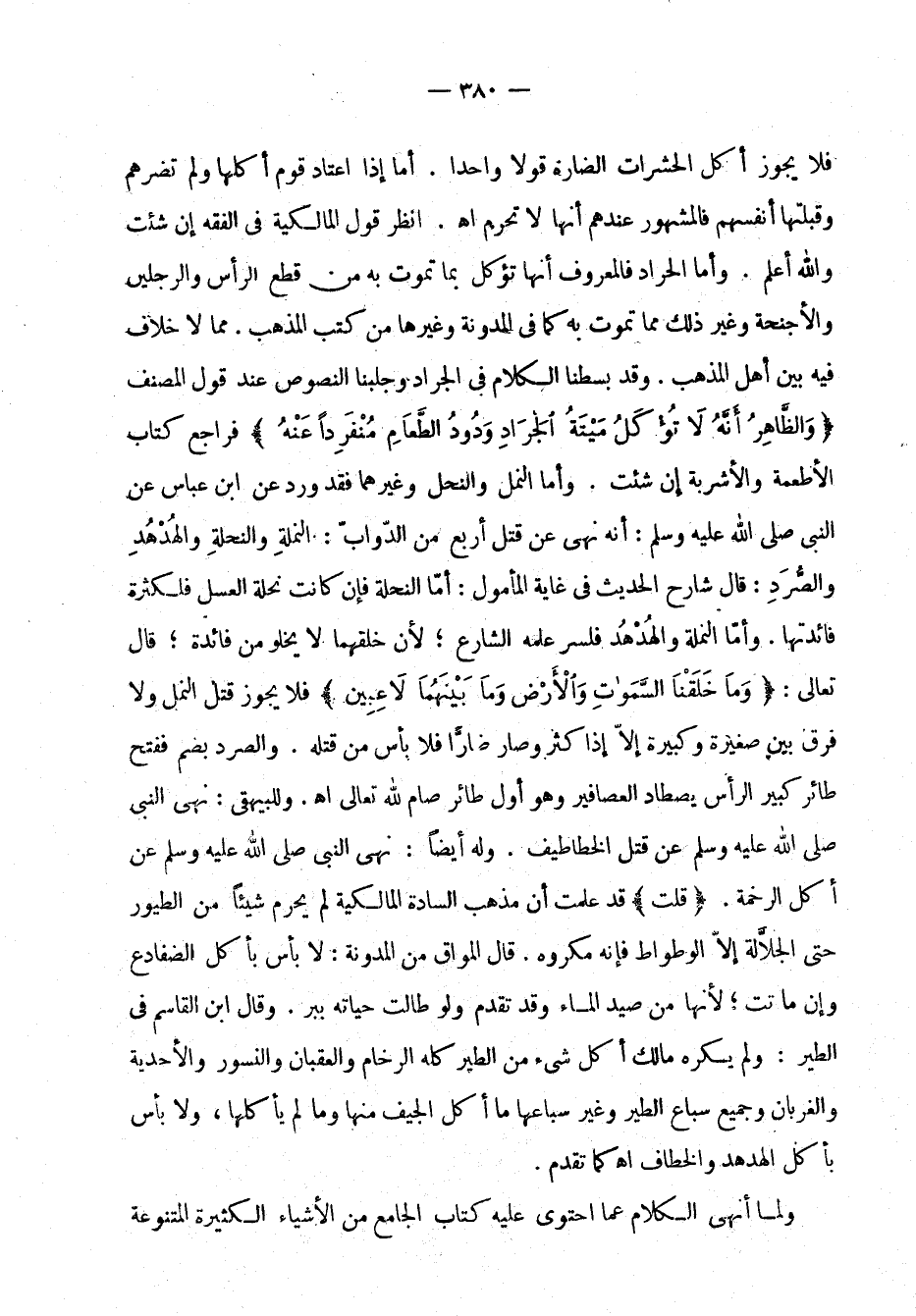 كُتب المذهب. مما لا خلاف فيه بين أهل المذهب. وقد بسطنا الكلام في الجراد وجلبنا النصوص عند قول المصنف: (والظاهر أنه لا تُؤكَل ميتة الجراد ودود الطعام منفردًا عنه) فراجع كتاب الأطعمة والأشربة إن شئت. وأما النمل والنحل وغيرهما فقد ورد عن ابن عباس عن النبي صلى الله عليه وسلم: أنه نهى عن قتل أربع من الدواب: (النملة والنحلة والهدهد والصرد): قال شارح الحديث في غاية المأمول: أما النحلة فإن كانت نحلة العسل فلكثرة فائدتها. وأما النملة والهدهد فلسر علمه الشارع؛ لأن خلقهما لا يخلو من فائدة؛ قال تعالى: {وما خلقنا السماوات والأرض وما بينهما لاعبين} [الأنبياء: 16] فلا يجوز قتل النمل ولا فرق بين صغيرة وكبيرة إلا إذا كثر وصار ضارًا فلا بأس من قتله. والصرف بضم ففتح طائر كبير الرأس يصطاد العصافير وهو أول طائر صام لله تعالى اهـ. وللبيهقي: نهى النبي صلى الله عليه وسلم عن قتل الخطاطيف. وله أيضًا: نهى النبي صلى الله عليه وسلم عن أكل الرخمة. قلت: قد علمت أن مذهب السادة المالكية لم يحرم شيئًا من الطيور حتى الجلالة إلا الوطواط فإنه مكروه. قال المواق من المدونة: لا بأس بأكل الضفادع وإن ماتت؛ لأنها من صيد الماء وقد تقدم ولو طالت حياته ببر. وقال ابن القاسم في الطير: ولم يكره مالك أكل شيء من الطير كله الرخام والعقبان والنسور والأحدية والغربان وجميع سباع الطير وغير سباعها ما أكل الجيف منها وما لم يأكلها، ولا بأس بأكل الهدهد والخطاف اهـ كما تقدم.