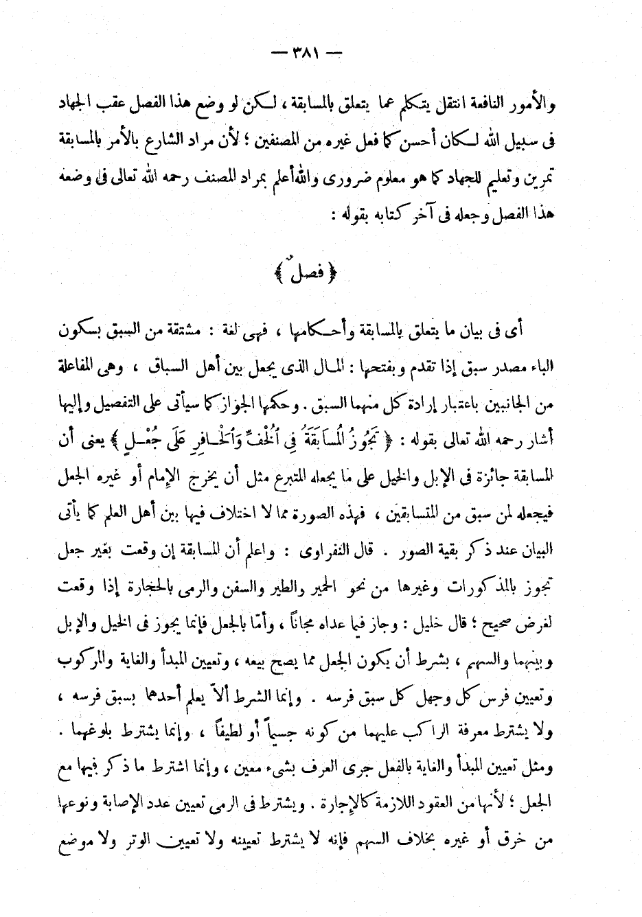 والأمور النافعة انتقل يتكلم على ما يتعلق بالمسابقة، لكن لو وضع هذا الفصل عقب الجهاد في سبيل الله لكان أحسن كما فعل غيره من المصنفين؛ لأن مراد الشارع بالأمر بالمسابقة تمرين وتعليم للجهاد كما هو معلوم ضروري والله أعلم بمراد المصنف رحمه الله تعالى في وضعه هذا الفصل وجعله في آخر كتابه بقوله: