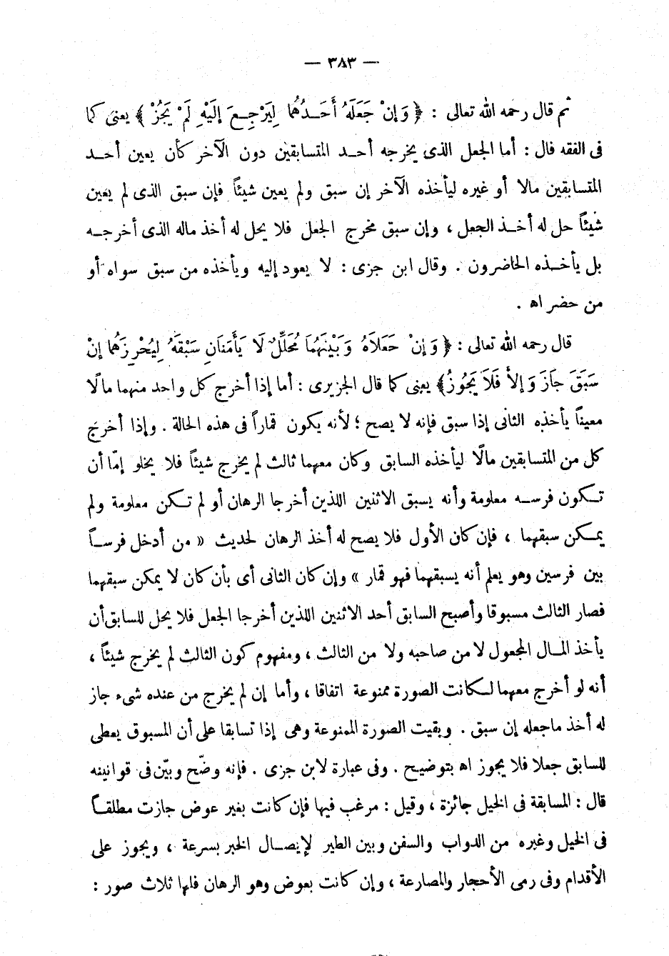 قال رحمه الله تعالى: (وإن جعلاه وبينهما محلل لا يأمنان سبقه ليُحرزهما إن سبق جاز وإلا فلا يجوز) يعني كما قال الجزيري: أما إذا أخرج كل واحد منهما مالاً معينًا يأخذه الثاني إذا سبق فإنه لا يصح؛ لأنه يكون قمارًا في هذه الحالة. وإذا أخرج كل من المتسابقين مالاً ليأخذه السابق وكان معهما ثالث لم يخرج شيئًا فلا يخلو إما أن تكون فرسه معلومة وأنه يسبق الاثنين اللذين أخرجا الرهان أو لم تكن معلومة ولم يمكن سبقهما، فإن كان الأول فلا يصح له أخذ الرهان لحديث: ((من أدخل فرسًا بين فرسين وهو يعلم أنه يسبقهما فهو قمار))، وإن كان الثاني أي بأن كان لا يمكن سبقهما فصار الثالث مسبوقًا وأصبح السابق أحد الاثنين اللذين أخرجا الجُعل فلا يحل للسابق أن يأخذ المال المجعول لا من صاحبه ولا من الثالث، ومفهوم كون الثالث لم يخرج شيئًا، أنه لو أخرج معهما لكانت الصورة ممنوعة اتفاقًا، وأما إن لم يخرج من عنده شيء جاز له أخذ ما جعله إن سبق. وبقيت الصورة الممنوعة وهي إذا تسابقا على أن المسبوق يعطي للسابق جُعلاً فلا يجوز اهـ بتوضيح. وفي عبارة لابن جزي. فإنه وضَّح وبين في قوانينه قال: المسابقة في الخيل جائزة، وقيل: مرغب فيها فإن كانت بغير عِوض جازت مطلقًا في الخيل وغيره من الدواب والسفن وبين الطير لإيصال الخبر بسرعة، ويجوز على الأقدام وفي رمي الأحجار والمصارعة، وإن كانت بعوض وهو الرهان فلها ثلاث صور: