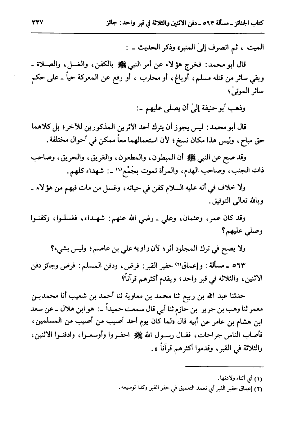563 - مَسْأَلَةٌ: وَإِعْمَاقُ حَفِيرِ الْقَبْرِ: فَرْضٌ، وَدَفْنُ الْمُسْلِمِ: فَرْضٌ وَجَائِزٌ دَفْنُ الِاثْنَيْنِ، وَالثَّلَاثَةِ فِي قَبْرٍ وَاحِدٍ، وَيُقَدَّمُ أَكْثَرُهُمْ قُرْآنًا؟