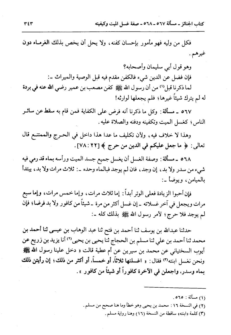 568 - مَسْأَلَةٌ: وَصِفَةُ الْغُسْلِ أَنْ يَغْسِلَ جَمِيعَ جَسَدِ الْمَيِّتِ وَرَأْسَهُ بِمَاءٍ قَدْ رُمِيَ فِيهِ شَيْءٌ مِنْ سِدْرٍ وَلَا بُدَّ، إنْ وُجِدَ، فَإِنْ لَمْ يُوجَدْ فَبِالْمَاءِ وَحْدَهُ -: ثَلَاثَ مَرَّاتٍ وَلَا بُدَّ، يُبْتَدَأُ بِالْمَيَامِنِ، وَيُوَضَّأُ -: فَإِنْ أَحَبُّوا الزِّيَادَةَ فَعَلَى الْوِتْرِ أَبَدًا: إمَّا ثَلَاثُ مَرَّاتٍ، وَإِمَّا خَمْسُ مَرَّاتٍ، وَإِمَّا سَبْعُ مَرَّاتٍ وَيَجْعَلُ فِي آخِرِ غَسَلَاتِهِ - إنْ غُسِّلَ أَكْثَرَ مِنْ مَرَّةٍ - شَيْئًا مِنْ كَافُورٍ وَلَا بُدَّ فَرْضًا، فَإِنْ لَمْ يُوجَدْ فَلَا حَرَجَ، لِأَمْرِ رَسُولِ اللَّهِ - صَلَّى اللَّهُ عَلَيْهِ وَسَلَّمَ - بِذَلِكَ كُلِّهِ -: حَدَّثَنَا عَبْدُ اللَّهِ بْنُ يُوسُفَ ثنا أَحْمَدُ بْنُ فَتْحٍ ثنا عَبْدُ الْوَهَّابِ بْنُ عِيسَى ثنا أَحْمَدُ بْنُ مُحَمَّدٍ ثنا أَحْمَدُ بْنُ عَلِيٍّ ثنا مُسْلِمُ بْنُ الْحَجَّاجِ ثنا يَحْيَى بْنُ يَحْيَى أَنَا يَزِيدُ بْنُ زُرَيْعٍ عَنْ أَيُّوبَ السِّخْتِيَانِيِّ عَنْ مُحَمَّدِ بْنِ سِيرِينَ عَنْ أُمِّ عَطِيَّةَ قَالَتْ «دَخَلَ عَلَيْنَا رَسُولُ اللَّهِ - صَلَّى اللَّهُ عَلَيْهِ وَسَلَّمَ - وَنَحْنُ نُغَسِّلُ ابْنَتَهُ فَقَالَ: اغْسِلْنَهَا ثَلَاثًا، أَوْ خَمْسًا، أَوْ أَكْثَرَ مِنْ ذَلِكَ، إنْ رَأَيْتُنَّ ذَلِكَ بِمَاءٍ وَسِدْرٍ، وَاجْعَلْنَ فِي الْآخِرَةِ كَافُورًا أَوْ شَيْئًا مِنْ كَافُورٍ» .