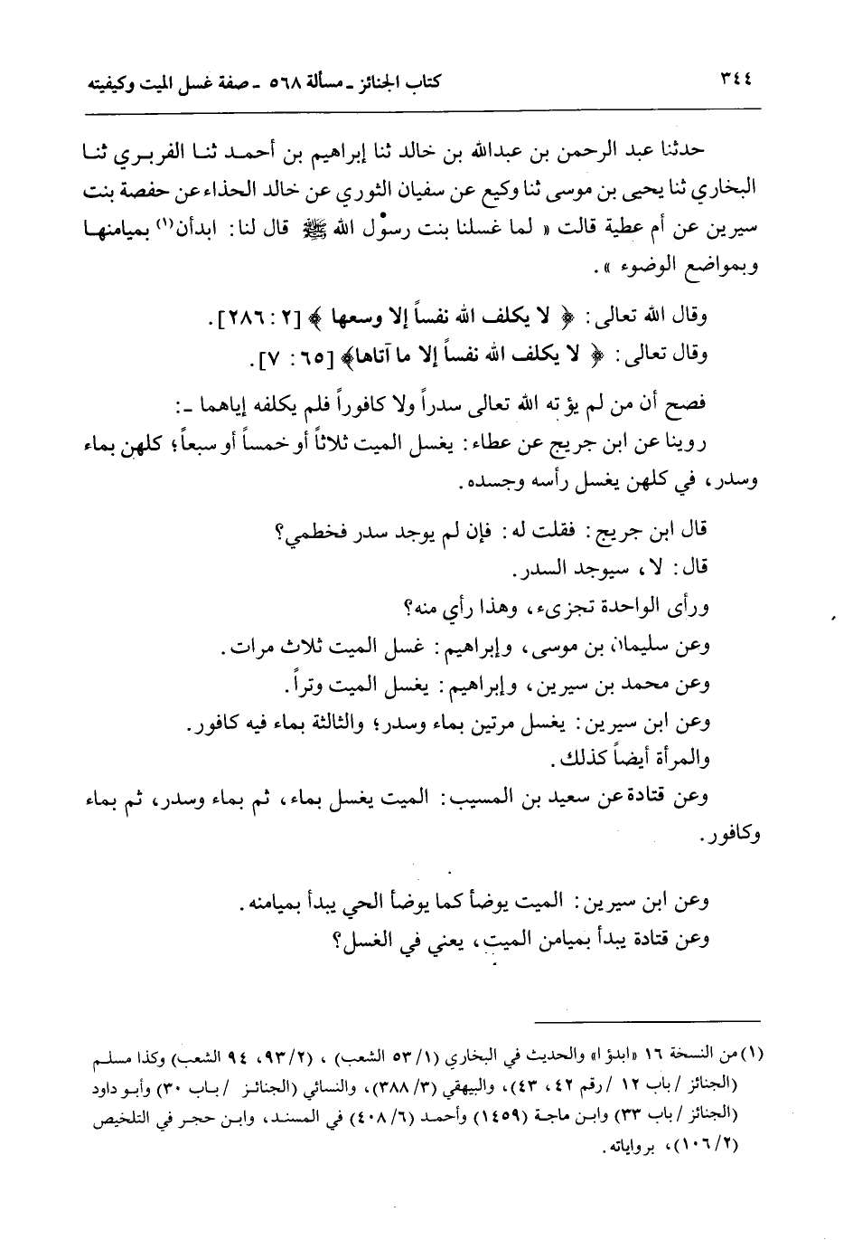 حَدَّثَنَا عَبْدُ الرَّحْمَنِ بْنُ عَبْدِ اللَّهِ بْنِ خَالِدٍ ثنا إبْرَاهِيمُ بْنُ أَحْمَدَ ثنا الْفَرَبْرِيُّ ثنا الْبُخَارِيُّ ثنا يَحْيَى بْنُ مُوسَى ثنا وَكِيعٌ عَنْ سُفْيَانَ الثَّوْرِيِّ عَنْ خَالِدٍ الْحَذَّاءِ عَنْ حَفْصَةَ بِنْتِ سِيرِينَ عَنْ «أُمِّ عَطِيَّةَ قَالَتْ لَمَّا غَسَّلْنَا بِنْتَ رَسُولِ اللَّهِ - صَلَّى اللَّهُ عَلَيْهِ وَسَلَّمَ - قَالَ لَنَا: ابْدَأْنَ بِمَيَامِنِهَا وَبِمَوَاضِعِ الْوُضُوءِ» .