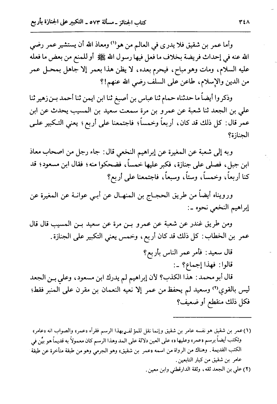 وَأَمَّا عُمَرُ بْنُ شَقِيقٍ فَلَا يُدْرَى فِي الْعَالَمِ مَنْ هُوَ وَمَعَاذَ اللَّهِ أَنْ يَسْتَشِيرَ عُمَرُ - رَضِيَ اللَّهُ عَنْهُ - فِي إحْدَاثِ فَرِيضَةٍ بِخِلَافِ مَا فَعَلَ فِيهَا رَسُولُ اللَّهِ - صَلَّى اللَّهُ عَلَيْهِ وَسَلَّمَ - أَوْ لِلْمَنْعِ مِنْ بَعْضِ مَا فَعَلَهُ - عَلَيْهِ السَّلَامُ -، وَمَاتَ وَهُوَ مُبَاحٌ، فَيُحَرِّمُ بَعْدَهُ، لَا يَظُنُّ هَذَا بِعُمَرَ إلَّا جَاهِلٌ بِمَحَلِّ عُمَرَ مِنْ الدِّينِ وَالْإِسْلَامِ، طَاعِنٌ عَلَى السَّلَفِ - رَضِيَ اللَّهُ عَنْهُمْ -؟ وَذَكَرُوا أَيْضًا مَا حَدَّثَنَاهُ حُمَامٌ ثنا عَبَّاسُ بْنُ أَصْبَغَ ثنا ابْنُ أَيْمَنَ ثنا أَحْمَدُ بْنُ زُهَيْرٍ ثنا عَلِيُّ بْنُ الْجَعْدِ ثنا شُعْبَةُ عَنْ عَمْرِو بْنِ مُرَّةَ سَمِعْت سَعِيدَ بْنَ الْمُسَيِّبِ يُحَدِّثُ عَنْ ابْنِ عُمَرَ قَالَ: كُلُّ ذَلِكَ قَدْ كَانَ، أَرْبَعًا وَخَمْسًا، فَاجْتَمَعْنَا عَلَى أَرْبَعٍ، يَعْنِي التَّكْبِيرَ عَلَى الْجِنَازَةِ؟